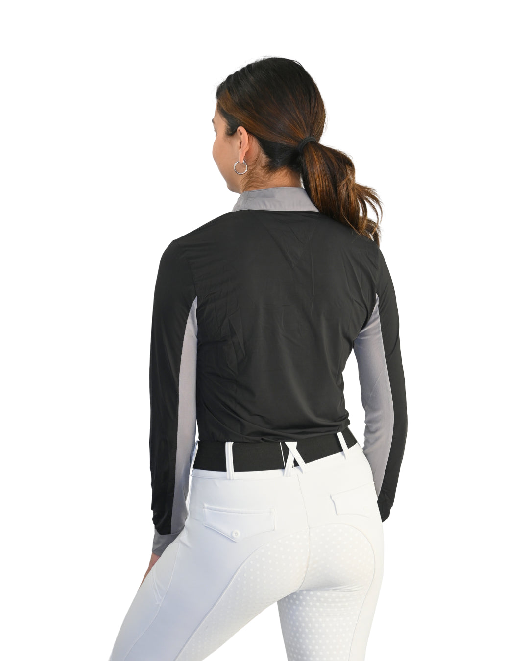 This black blingy sun shirt is crafted with 140 gram light summer fabric and mesh underarms for optimal sun protection and cool comfort. Perfect for summer riding, this shirt adds a touch of glamour with glitter bars framing the zipper and subtle rouching around the bust line. At a show ring, clinic, or at home, this shirt offers a flattering and elegant fit.