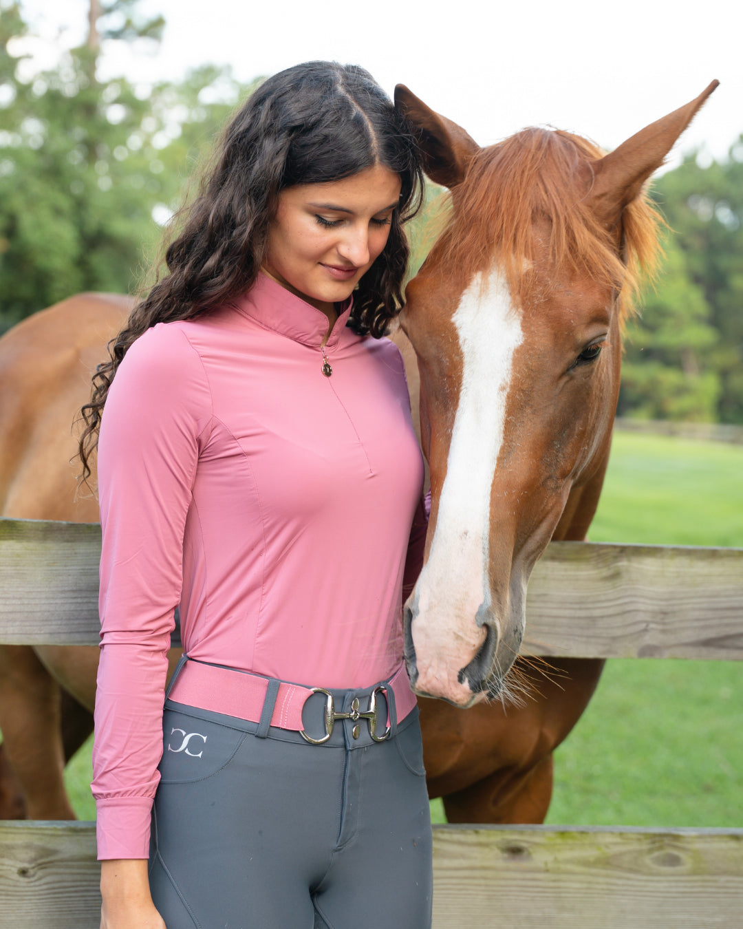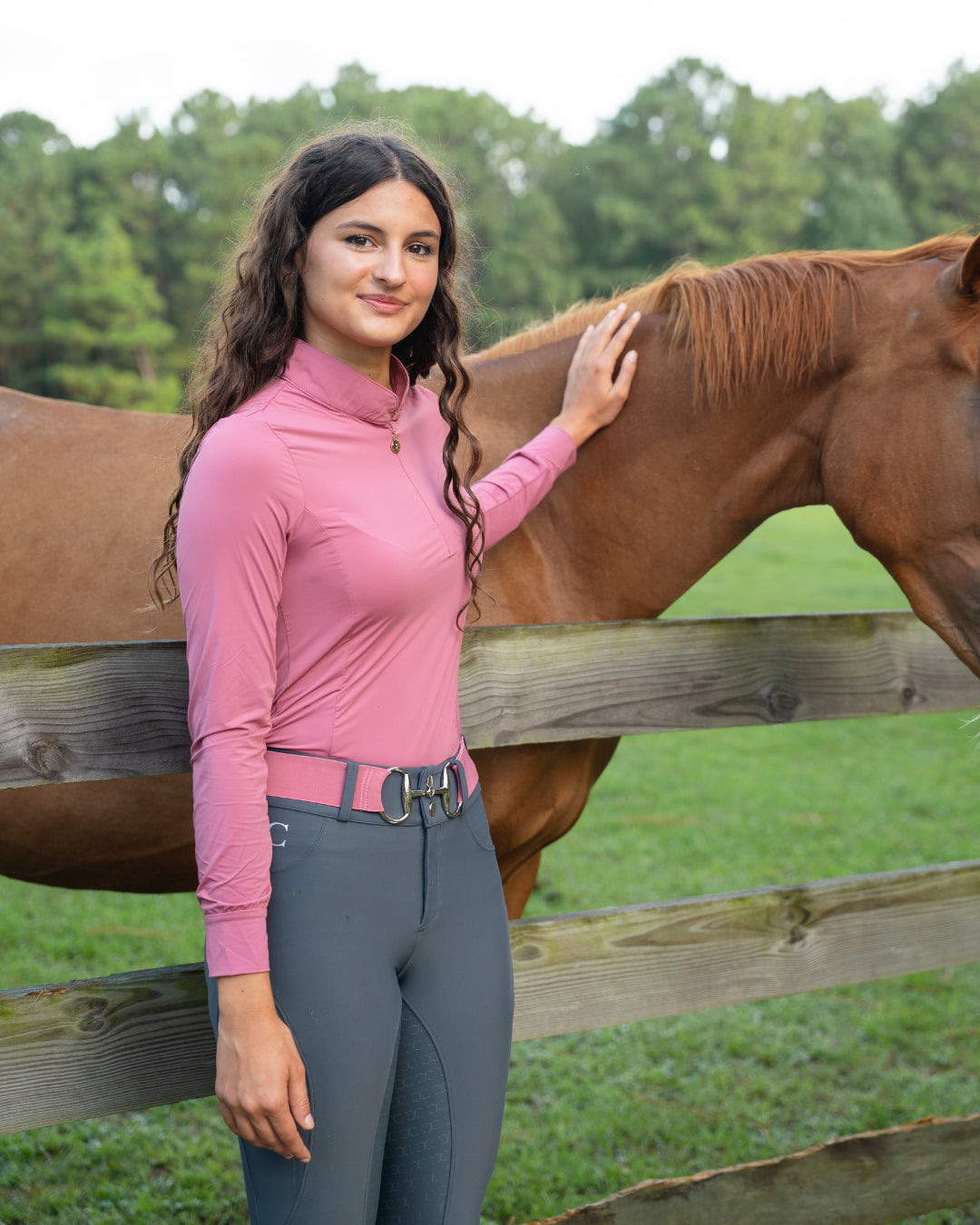 Cool and Comfortable with 150 gram light summer fabric for sun protection and mesh underarms this simple but stunning shirt is designed for summer riding or layering in the fall and spring.   Impeccable fit with a subtle gold zipper this shirt goes with any color breeches!