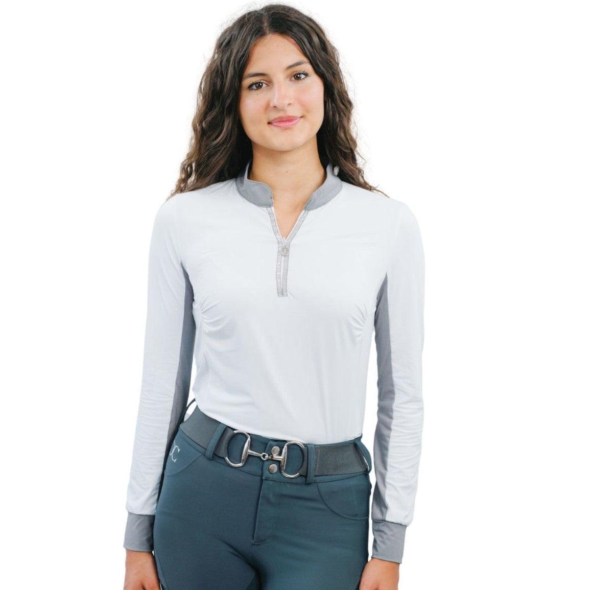 This white sun shirt is crafted with 180 gram light summer fabric and mesh underarms for optimal sun protection and cool comfort. Perfect for summer riding, this shirt adds a touch of glamour with glitter bars framing the zipper and subtle rouching around the bust line. Whether at a show ring, clinic, or at home, this shirt offers a flattering and elegant fit. Model is 5'7" and 140 lbs and is in a medium shirt and breech.