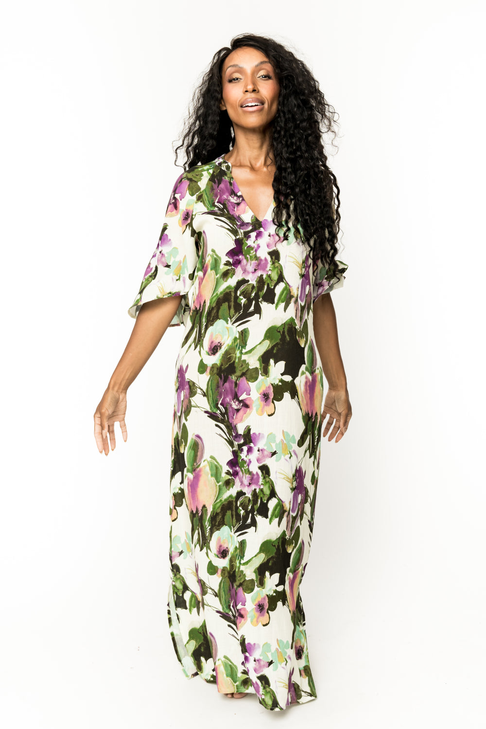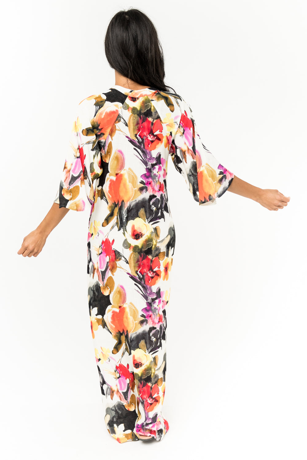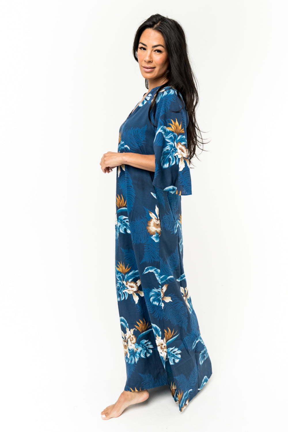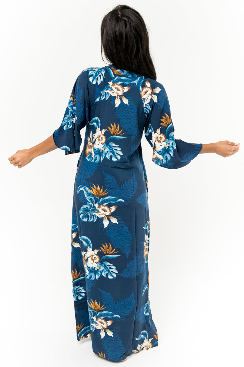 This 100% rayon gorgeous long dress is a masterpiece. A must for going to a party or dress down casual with sandals. Beautiful bell sleeves, Pockets and the perfect length with slits on each side. SKU# 22D356