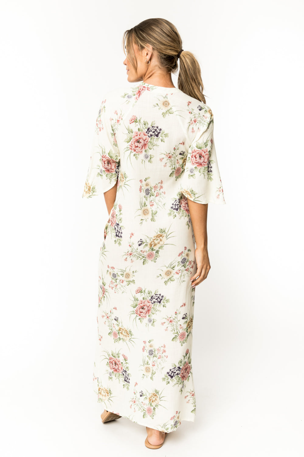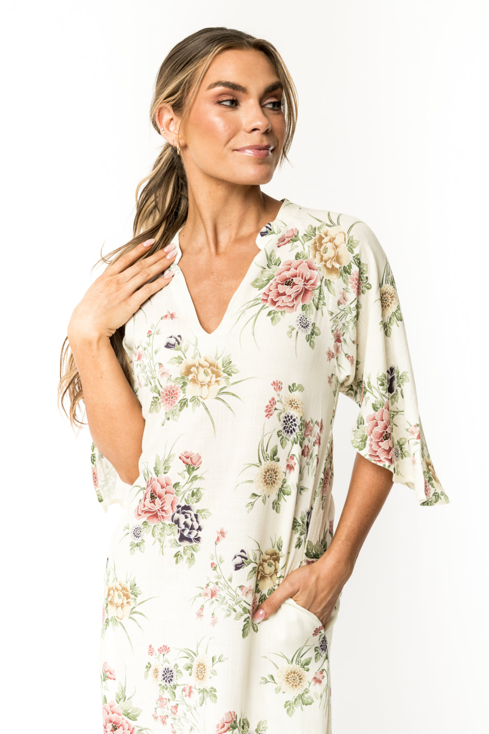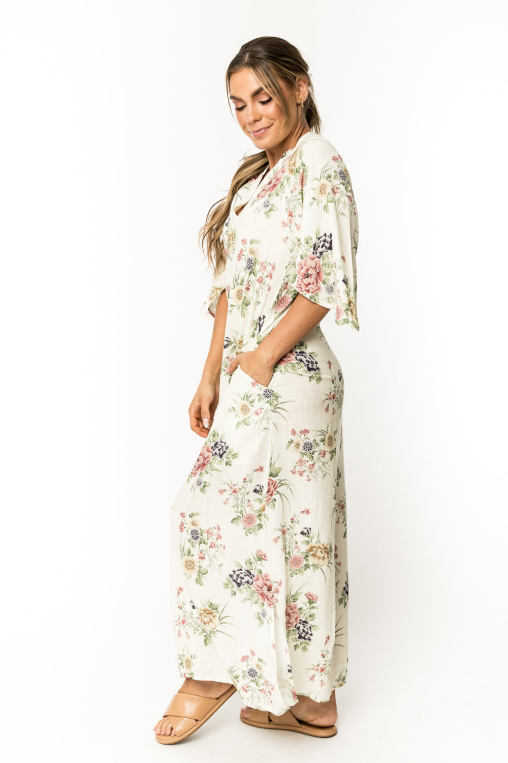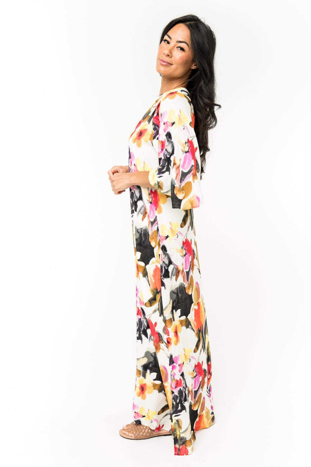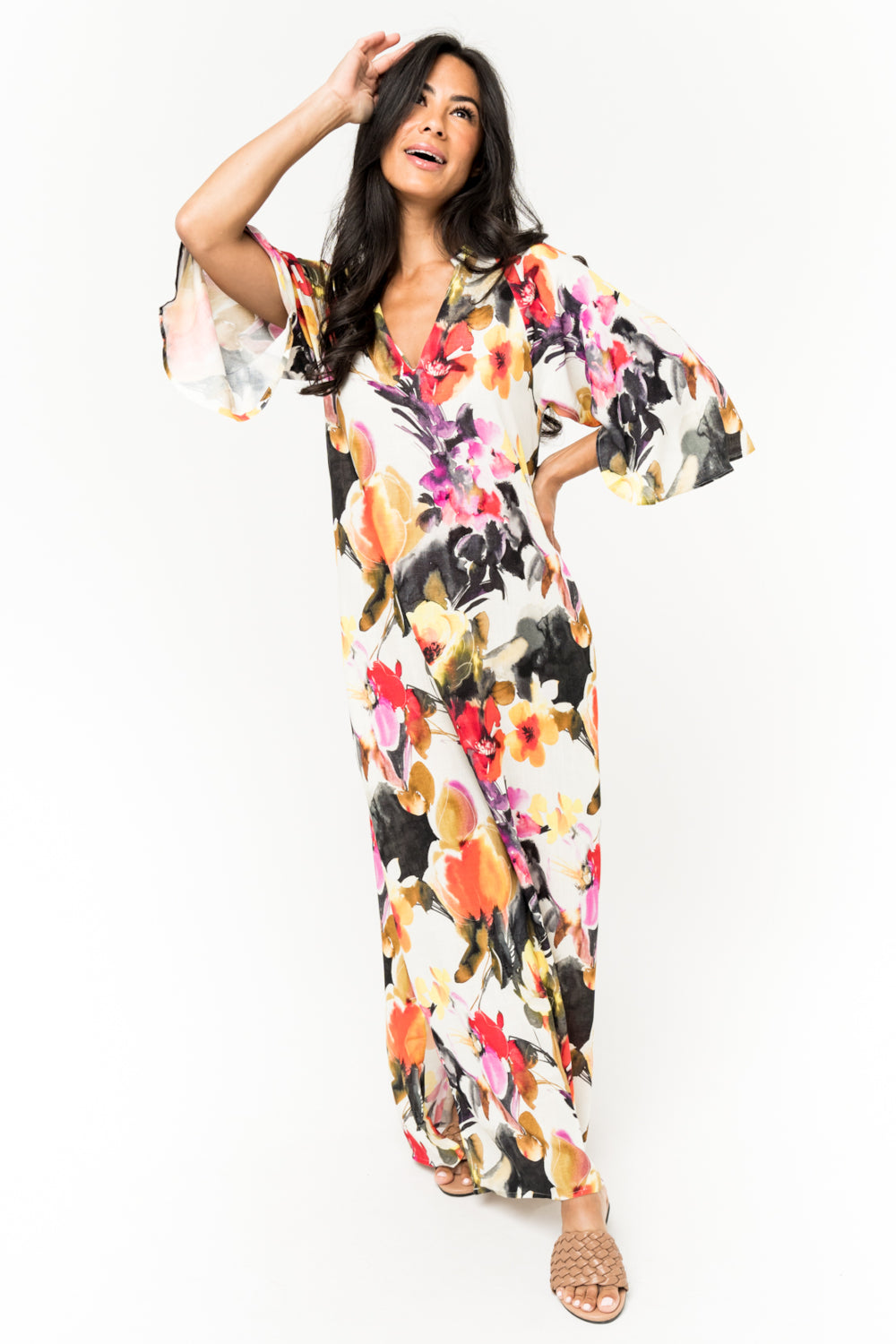 This 100% rayon gorgeous long dress is a masterpiece. A must for going to a party or dress down casual with sandals. Beautiful bell sleeves, Pockets and the perfect length with slits on each side. SKU# 22D356
