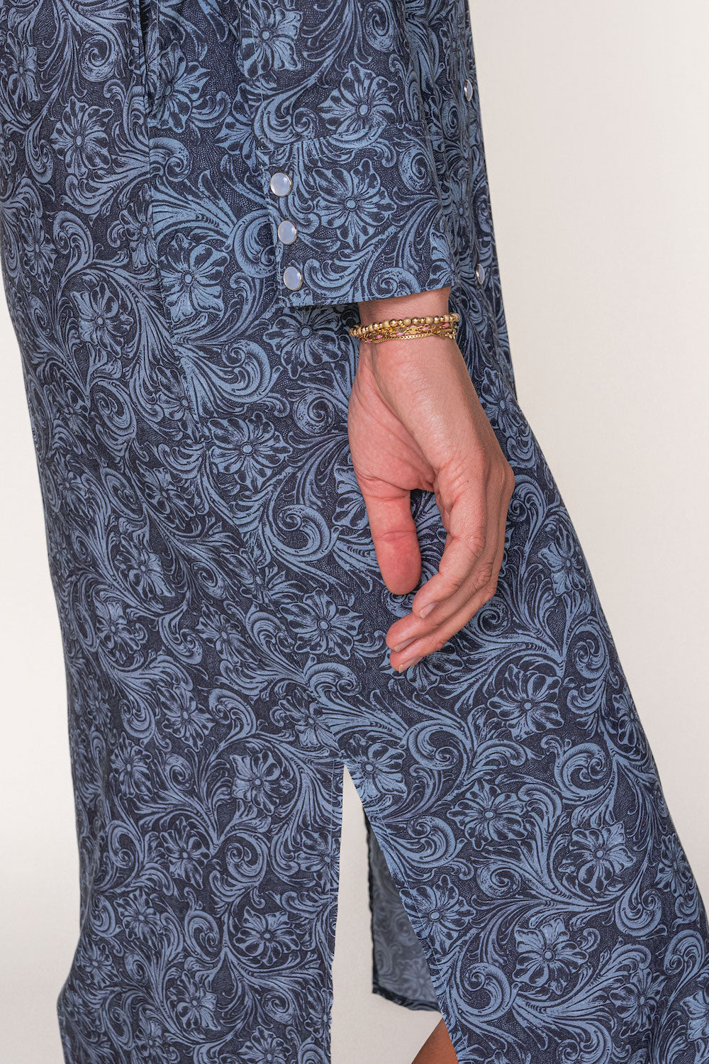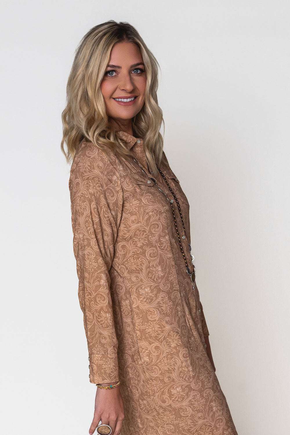 Boots may do the walking, but this dress does the talking. A Western fashionista’s dream, adorned with beautiful pearl snap buttons all down the front, with side slits and - of course - pockets. A timeless design that makes a bold statement in both comfort and style.