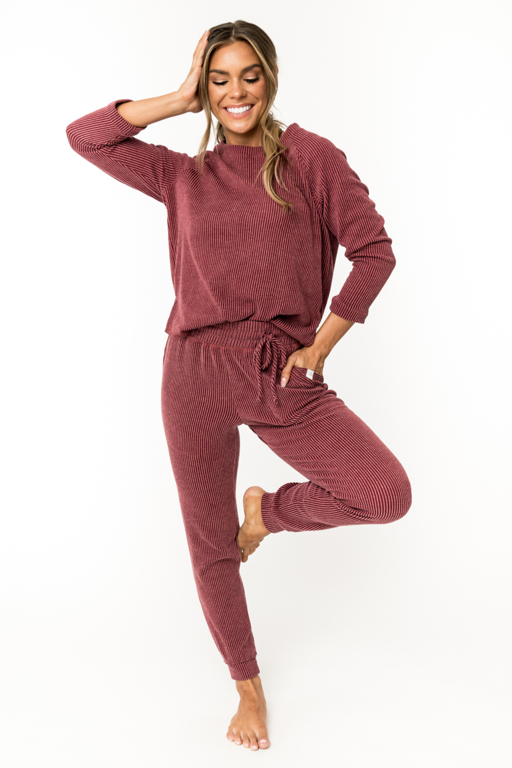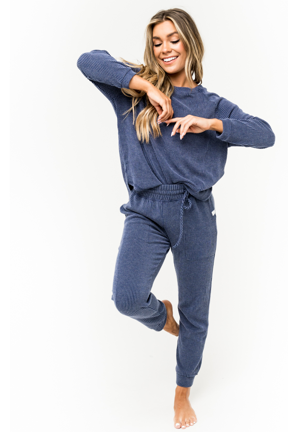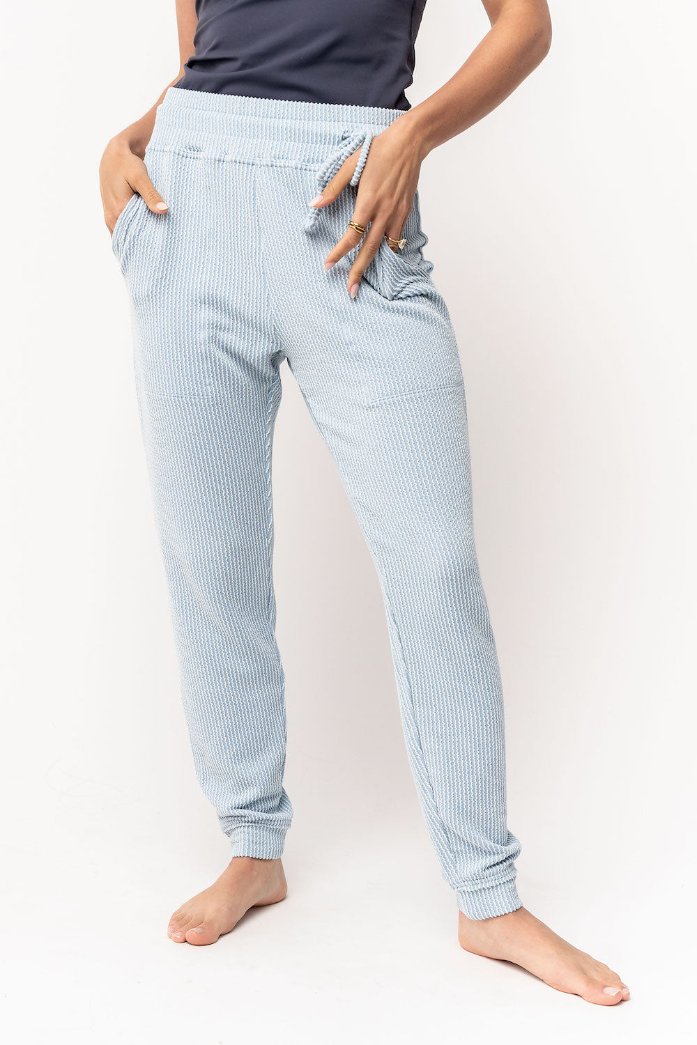 The "Boardwalk" jogger is so cute, and so-comfy. It goes perfectly with our "Cape Cod" crew neck in our ever-so-popular 'Urban Love' fabric. This jogger has two-pockets and a functional tie at the waist. This is a perfect piece for a stroll down the "Boardwalk," or simply chilling at home, with family and friends. Polyester/Rayon/Spandex blend. 26 in. inseam above ankle. SKU# 22P554.