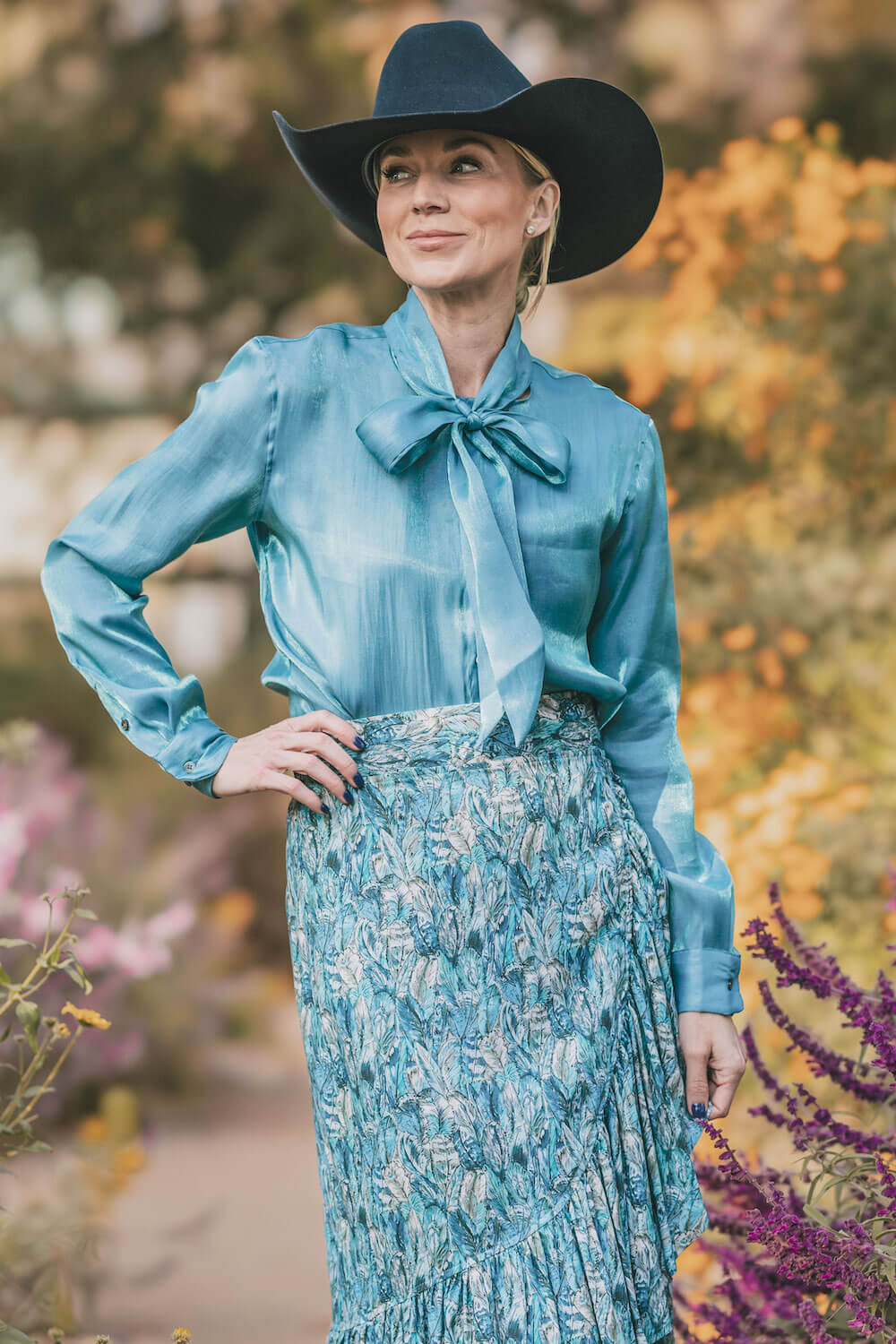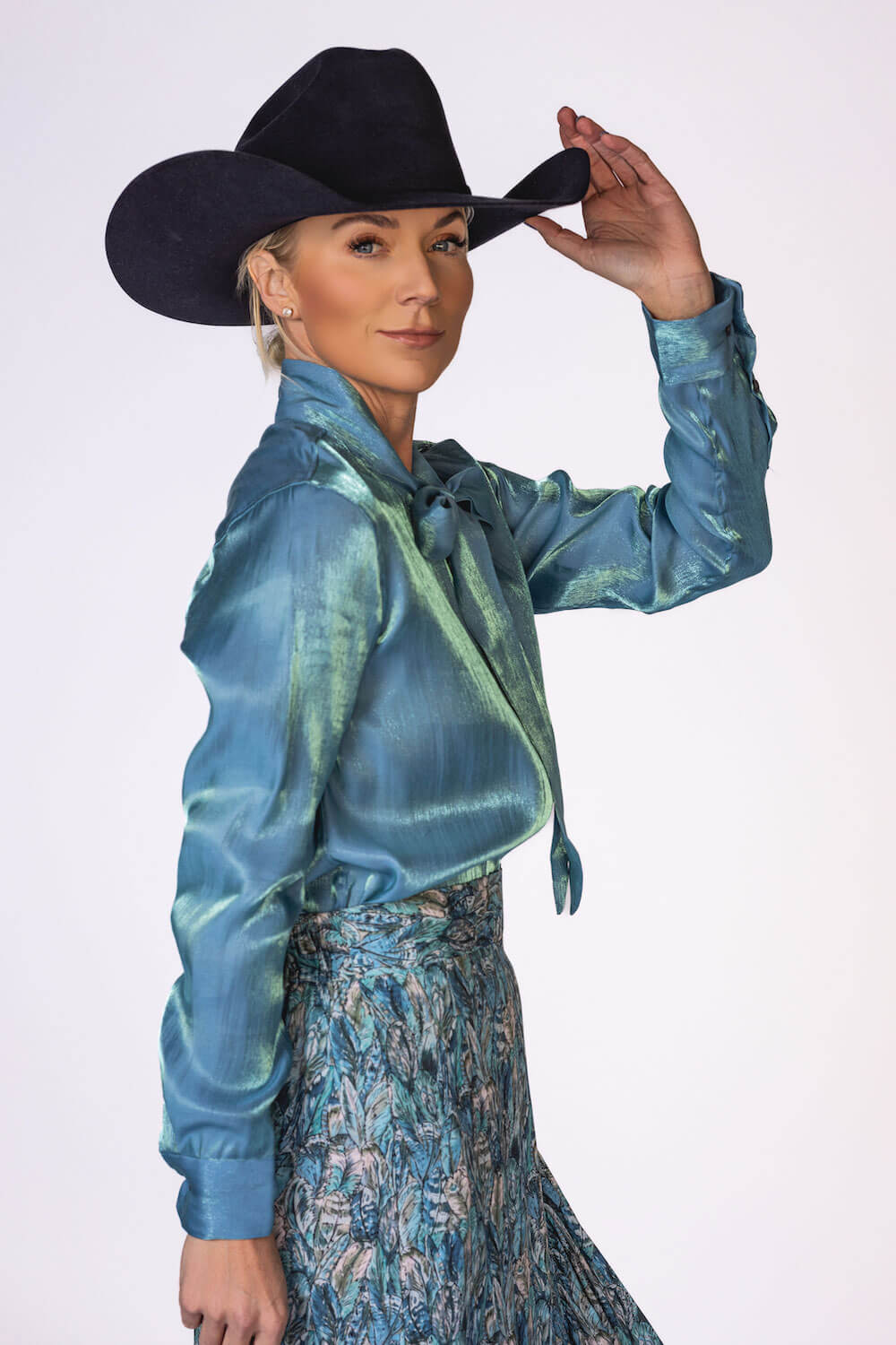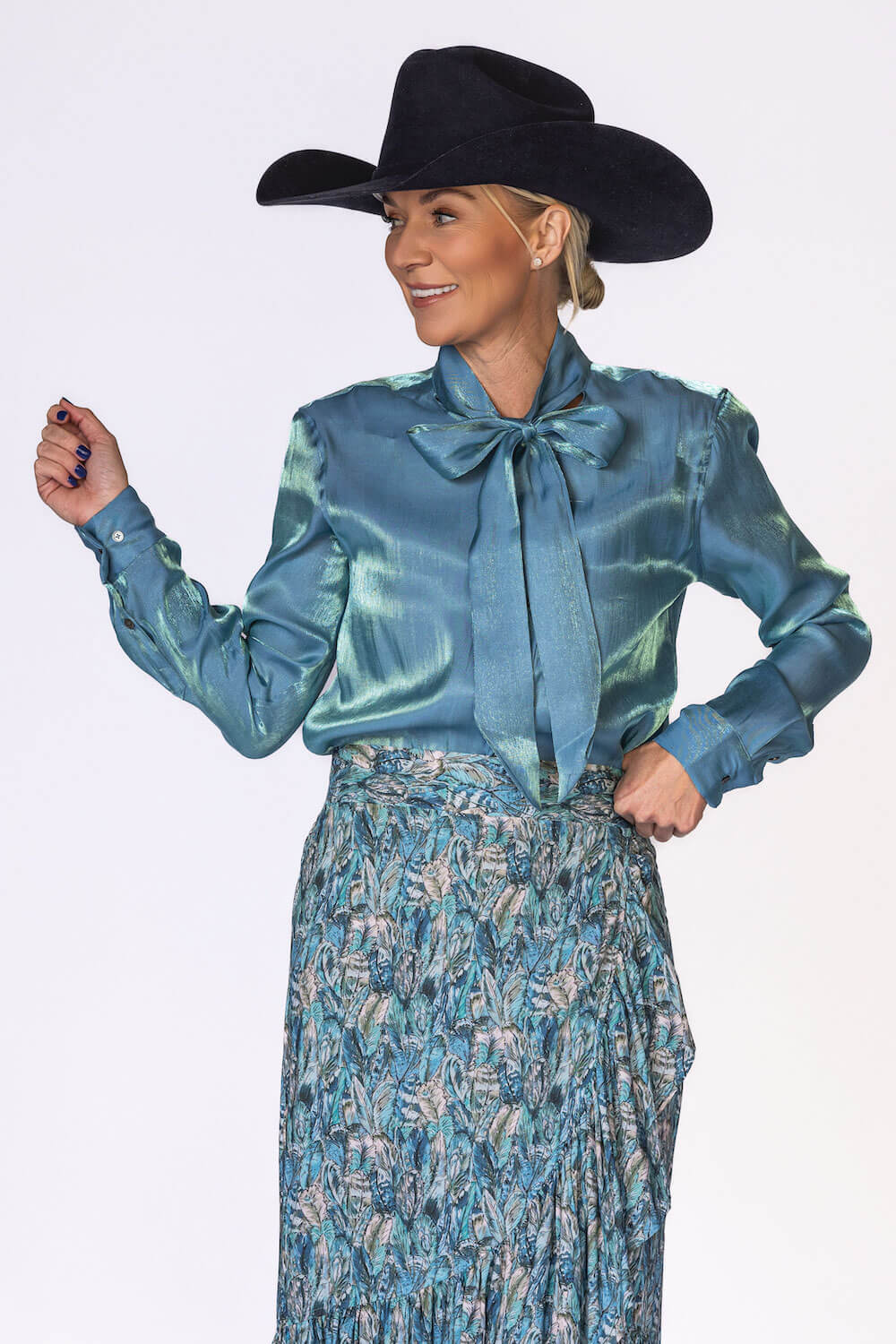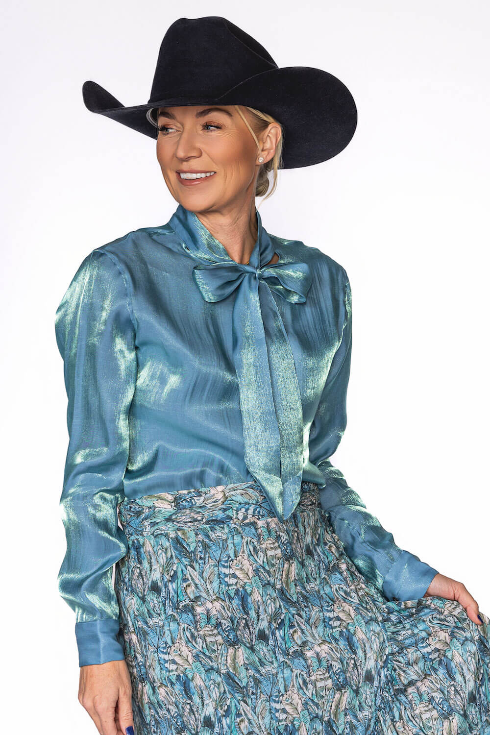 Step into the spotlight with this women’s western-style shirt, designed to turn heads with its iridescent shimmer and classic cowboy-inspired details. The connected bow tie neckline adds a touch of feminine sophistication, while the long sleeves offer timeless style and versatility. SKU# 25WS1804.
