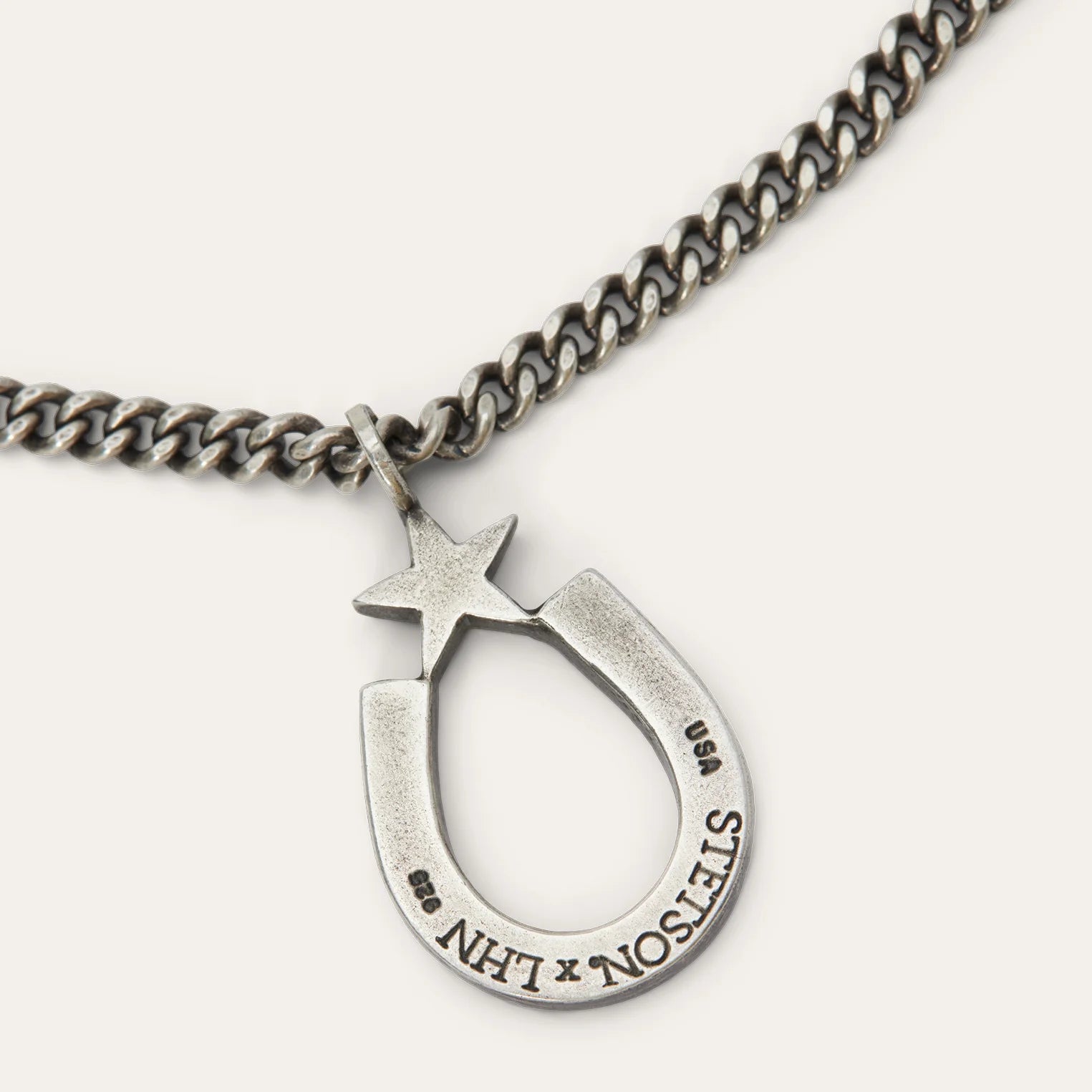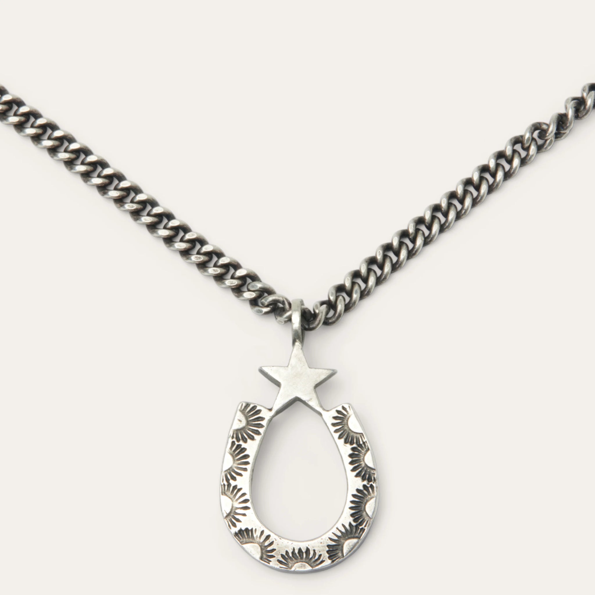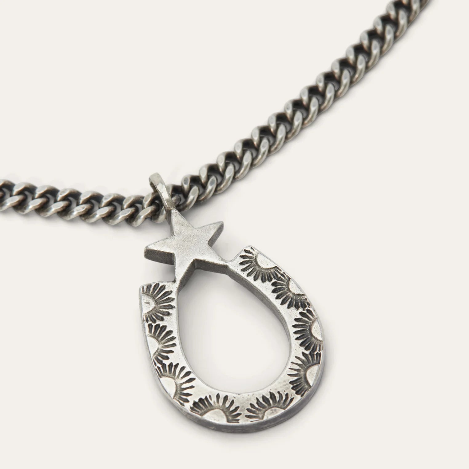 A well-known symbol for good luck, the horseshoe is also known to be a protective symbol for the wearer. With ornate stampings, this horseshoe pendant has a brushed patina finish and arrives with a heavy sterling silver chain for a timeless look.