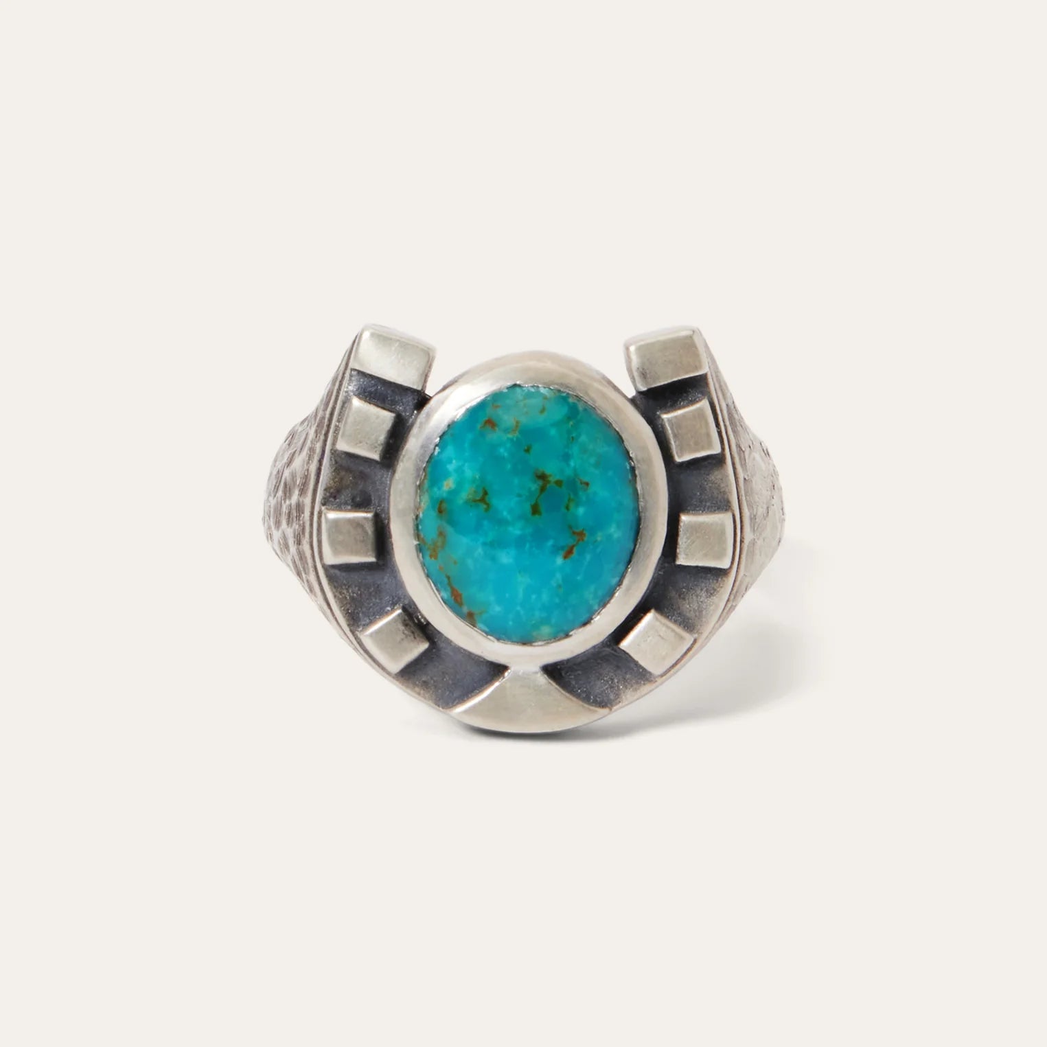 Known as the “Sky Stone," the turquoise gemstone has been a feature of the Southwest for millennia. This sterling silver ring features the well-known symbol for good luck, a horseshoe motif, which is also known to be a protective symbol for the wearer.