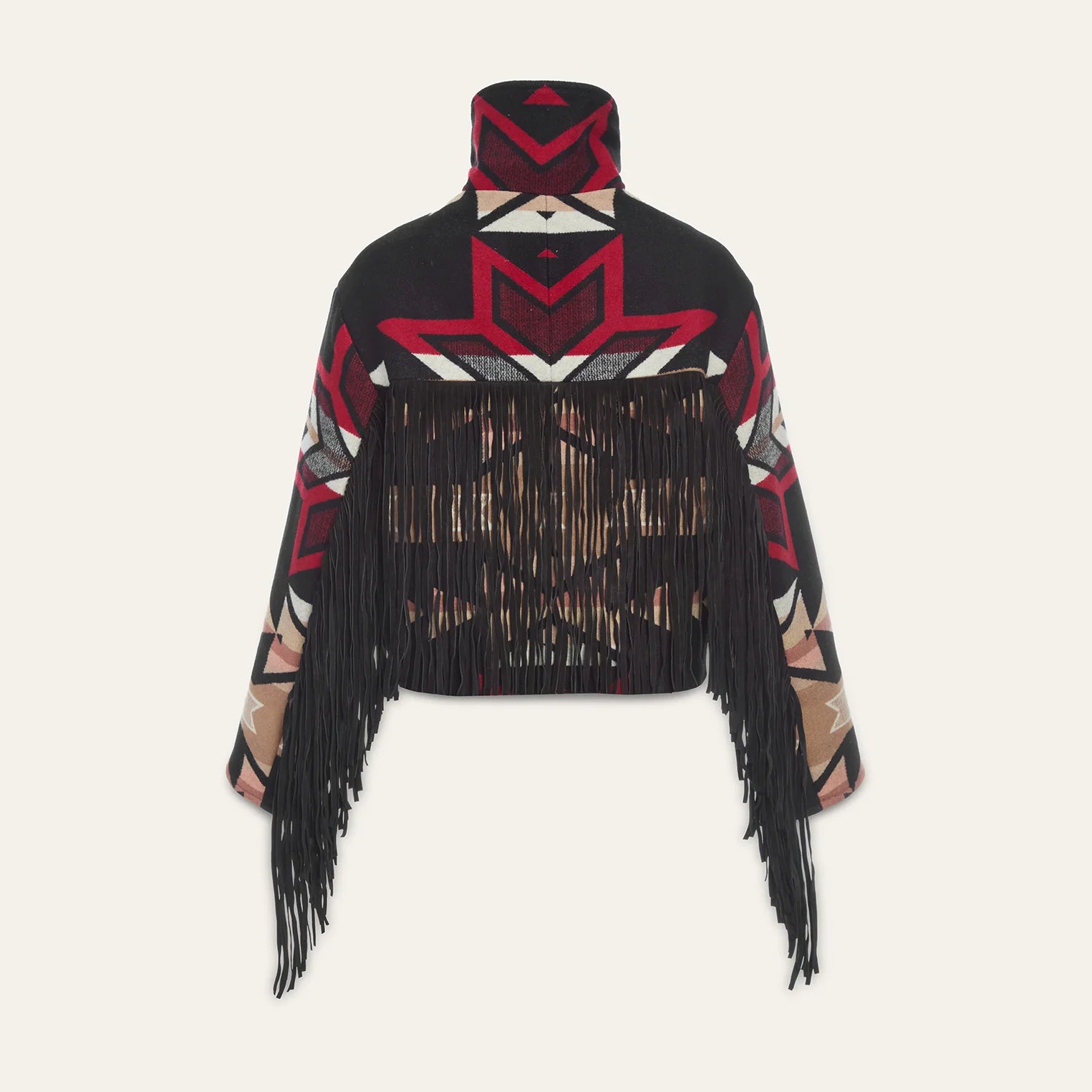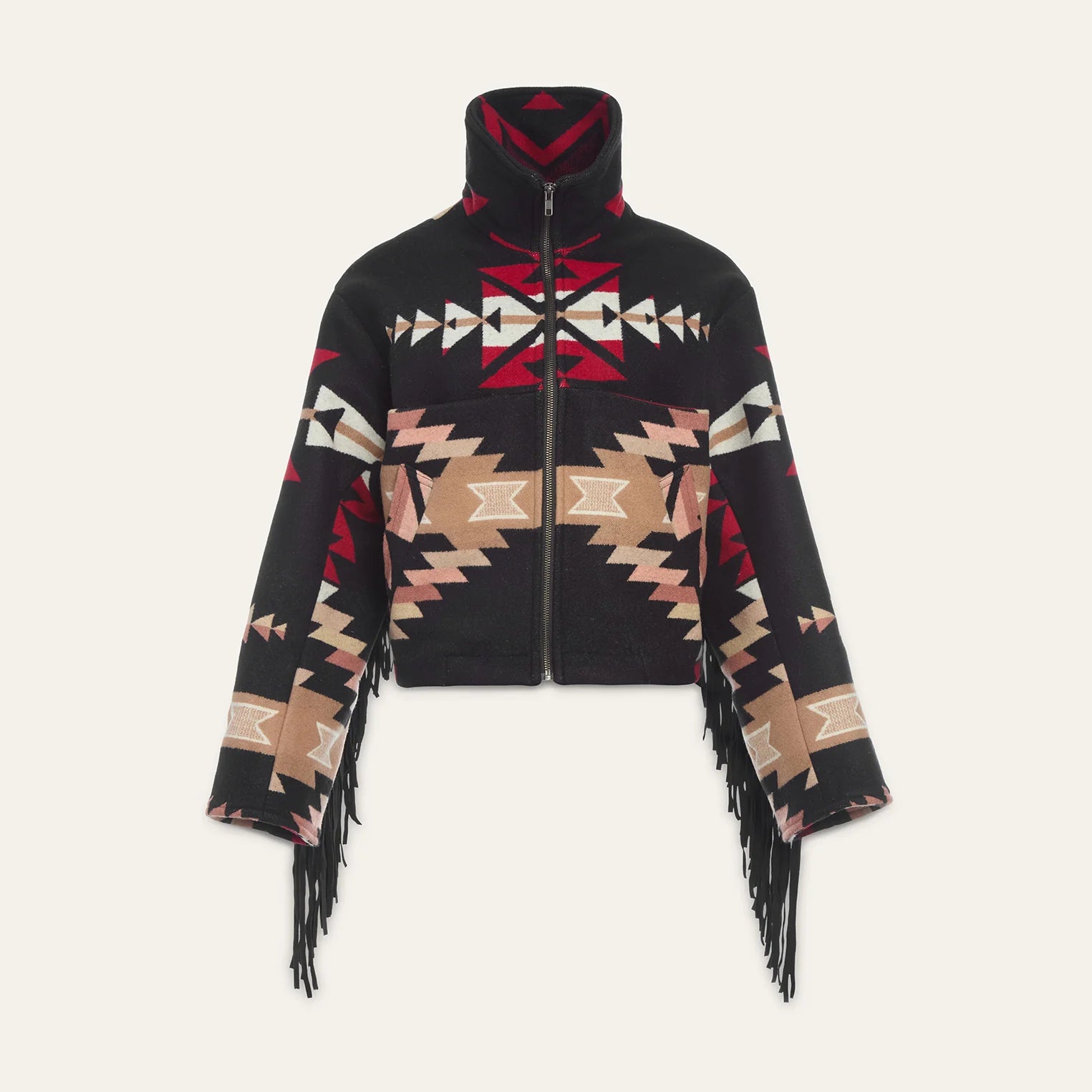 This luxurious slouch jacket is crafted from unwoven Pendleton blankets and is cut and sewn in Lindsey Thornburg’s New York City atelier. It features statement-making suede fringe across its back and back sleeve seams. It features chest seam pockets, welted waist pockets, zipper fastenings, and full silk rayon peachskin lining.