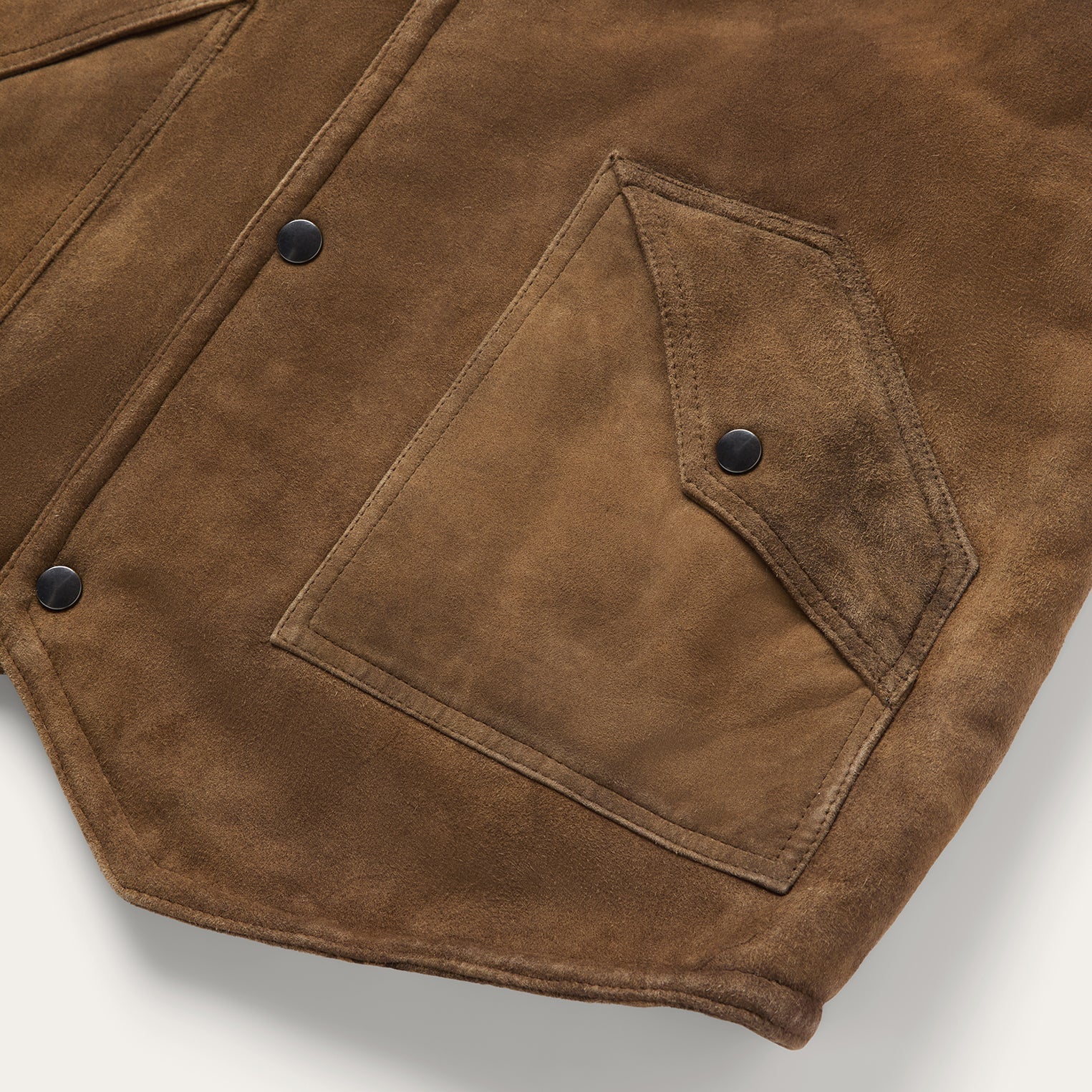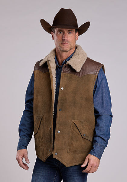 Crafted from high-quality suede leather with a vintage-inspired finish, the Distressed Suede Vest combines rugged western character with cold-weather comfort. It features contrast chocolate brown yokes, an oversized sherpa-lined collar, and a fully sherpa-lined interior for added warmth. With a full snap front and angled patch pockets with snap closures, it’s a functional outer layer with timeless western style.