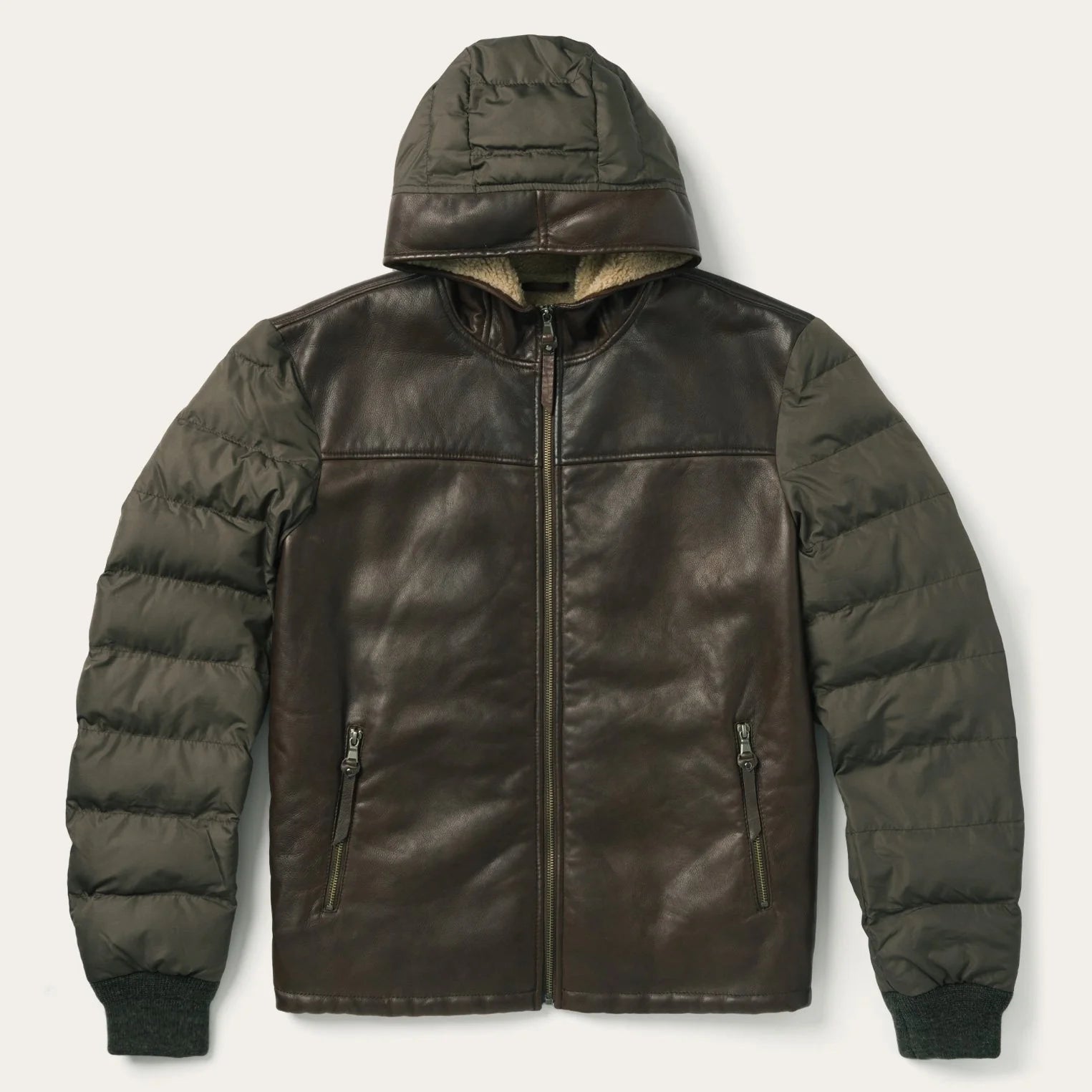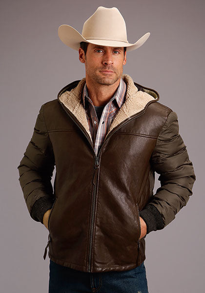 Keep warm in true western style! This well-built and sturdy leather hooded jacket has a full zip front and hand pockets. The jacket features a sherpa lining and has a straight front and back yoke. Get the job done in hard-working gear that you'll reach for every morning.