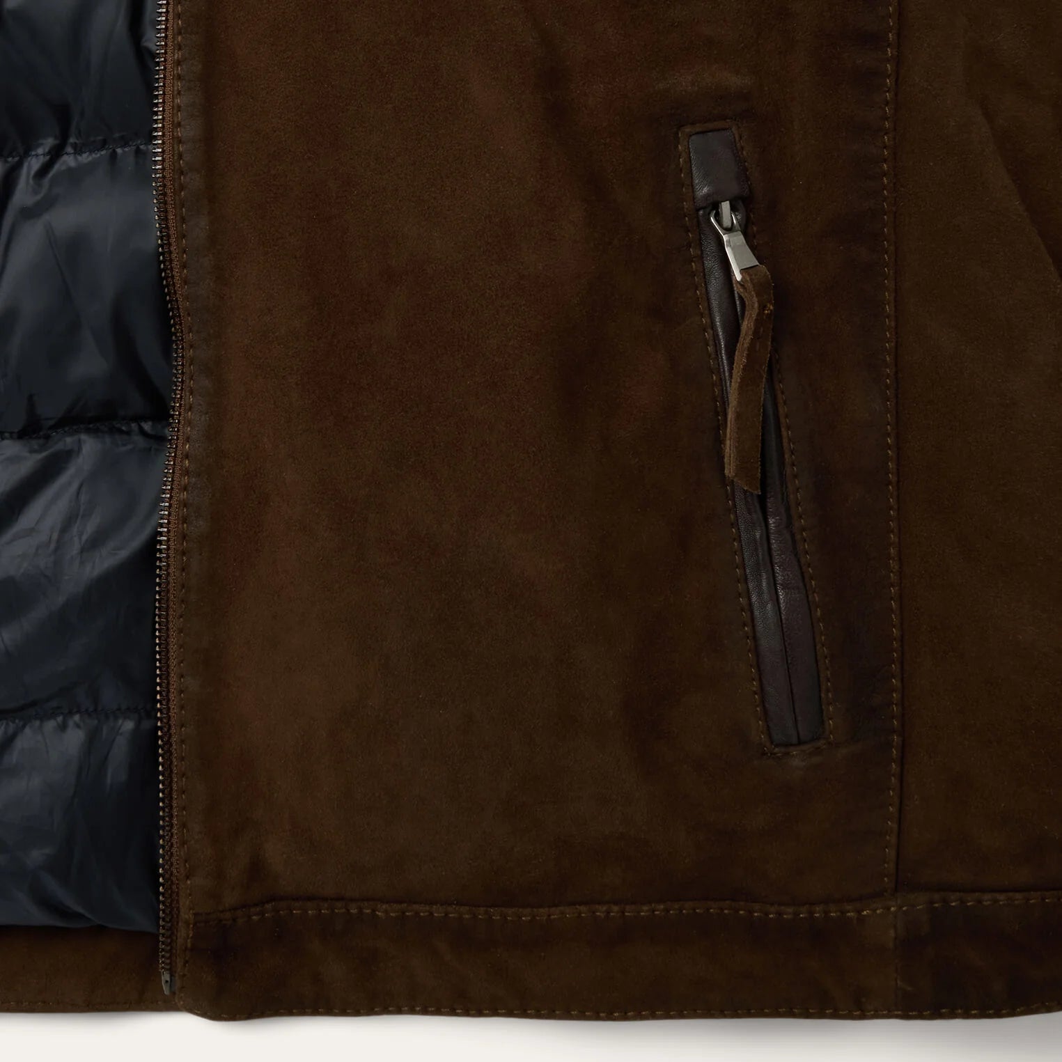 This Stetson Men's Brown Suede Moto Jacket 6643 is crafted from high-quality suede leather and has a rugged, western-inspired style. It features a stand collar, full front zip closure, horizontal zip chest pockets, angled zip hand pockets, leather zipper pulls and snap cuffs. At Stetson, we've been outfitting men who venture into cold, weather-worn territories since 1865—this is quality you can rely on.