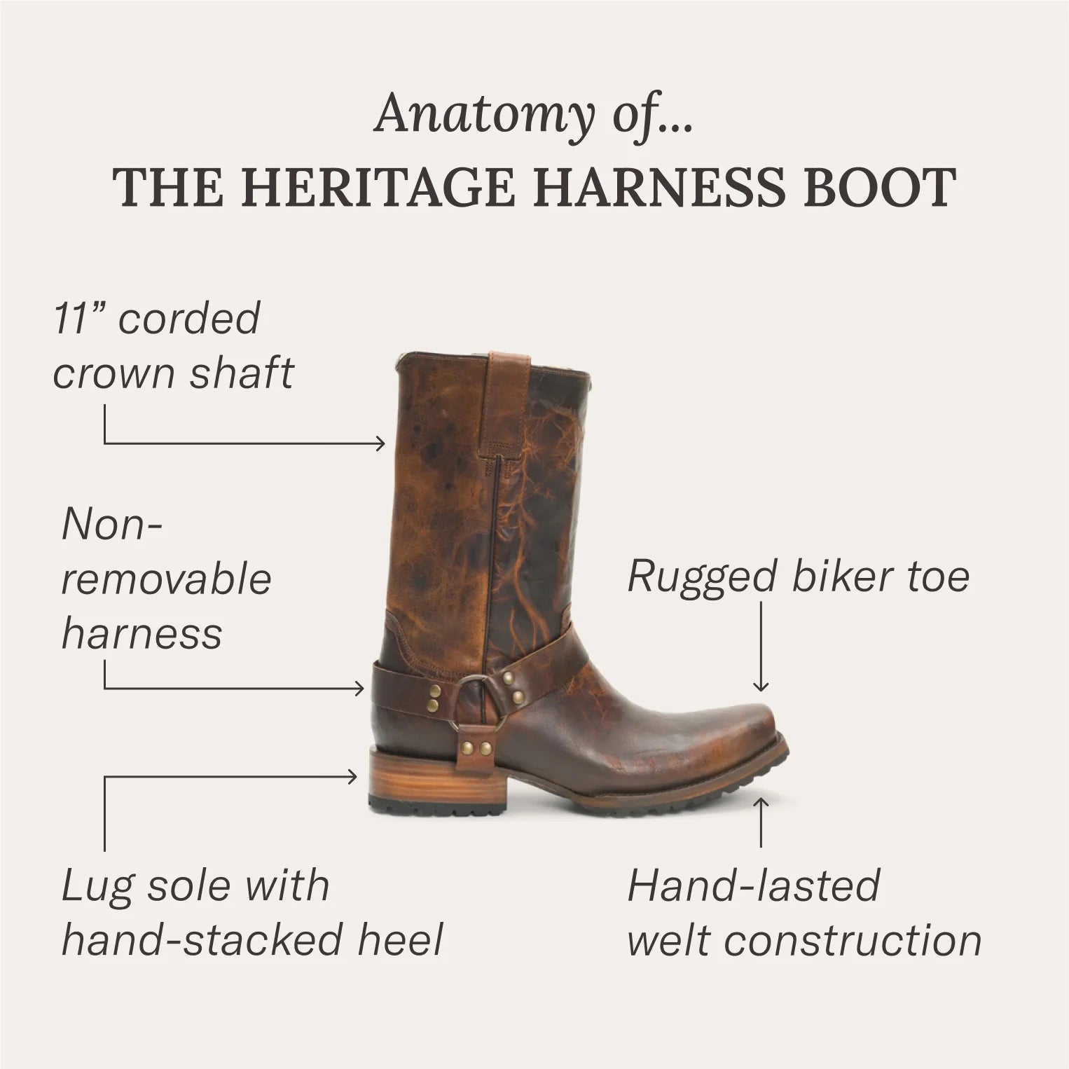 The Stetson Men's Heritage Harness Brown Leather Biker Toe Boots 4124 features a leather vamp and 11” shaft with a fixed harness strap and biker toe—a tapered square toe style that's wider than a snip. It’s finished with a leather walking heel and a ¾ welt lug sole, secured with brass nails and lemonwood pegs, for added traction and durability. Inside, a removable Tru-X insole and premium cowhide leather lining provide lasting comfort and support.