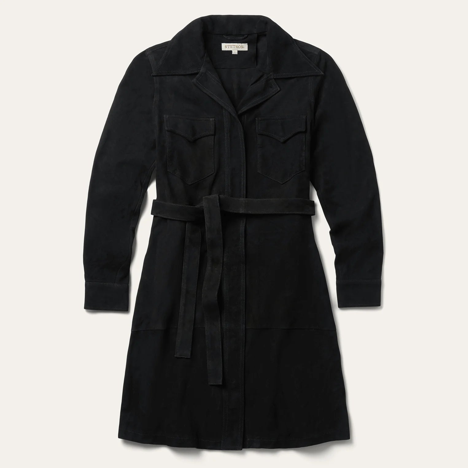 The Suede Western Shirt Dress is crafted from supple suede that brings a refined edge to a classic western silhouette. It features an oversized notch collar, a full snap front with a hidden placket, and a deep single-point back yoke. Patch pockets with flaps add functional detail, while a self-tie belt flatters the waist. Finished with single-snap cuffs, it’s a statement-making piece with timeless western character.