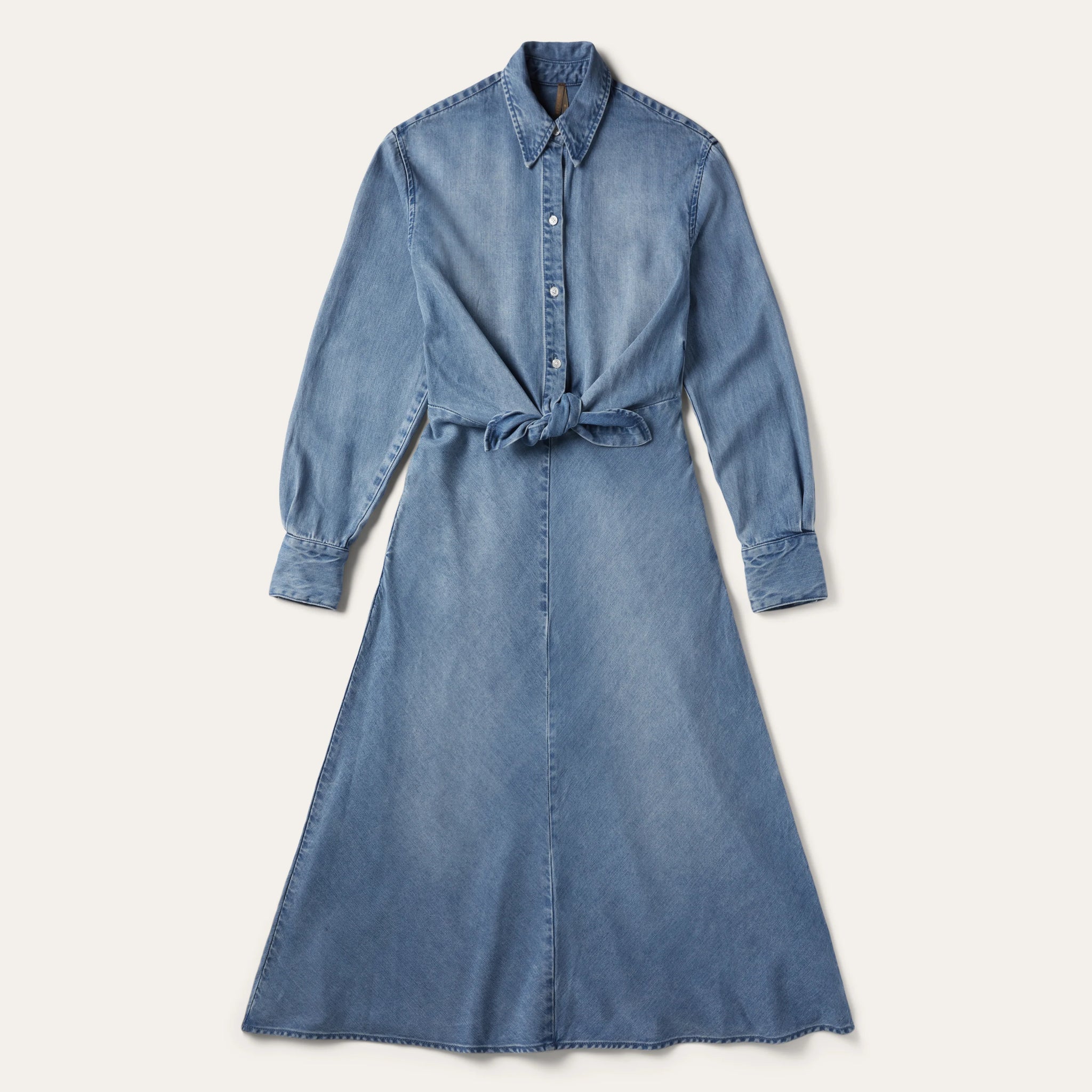 Inspired by your favorite denim shirt, this long-sleeve, mid-length dress features a button-front bodice closure, an elastic back waistline with gathers and a self-tie waist. It has a fold-down collar, pleated and cuffed sleeves and two side seam pockets. Made from sustainable Tencel denim, it pairs equally well with a cowboy hat and boots as it does with a sun hat and sandals.