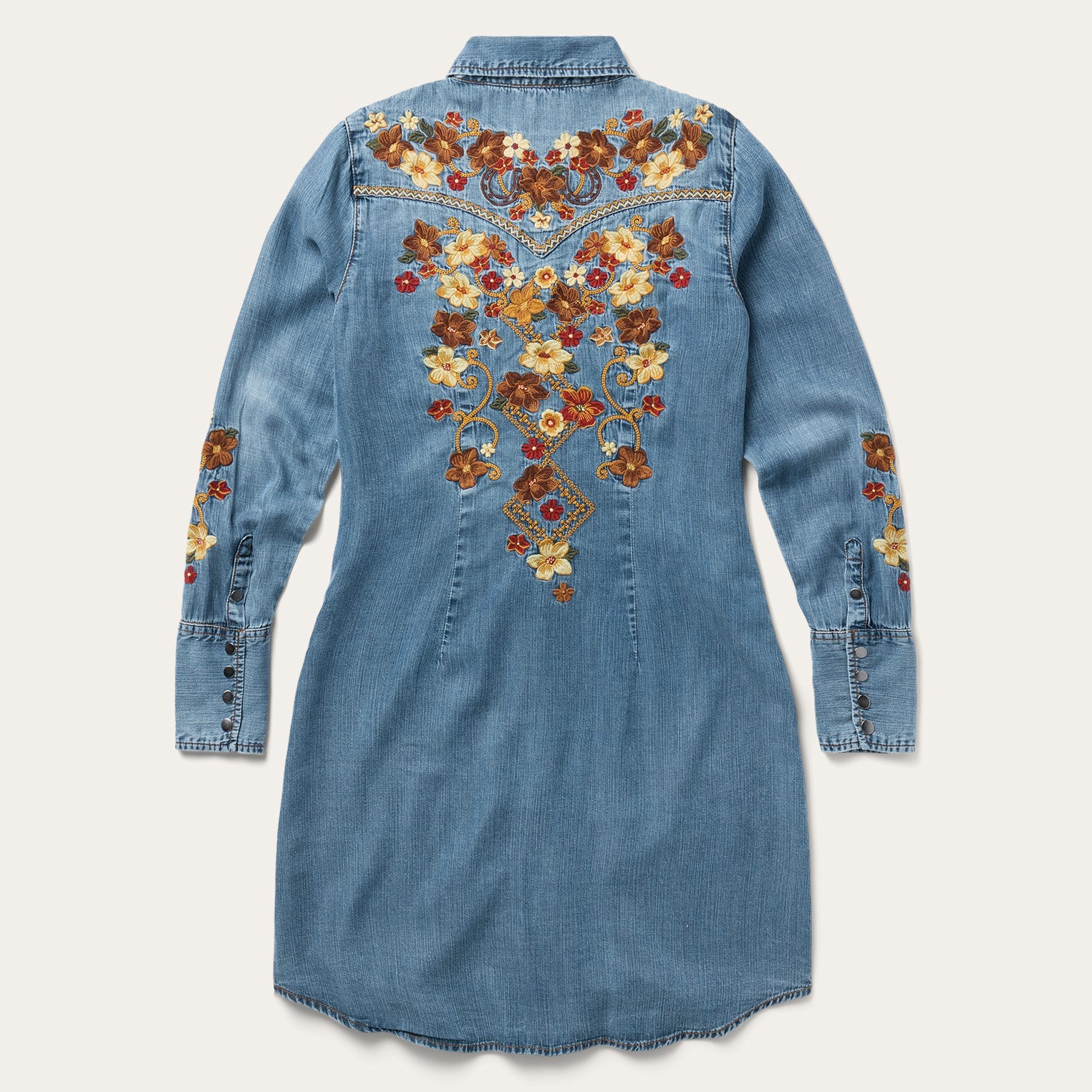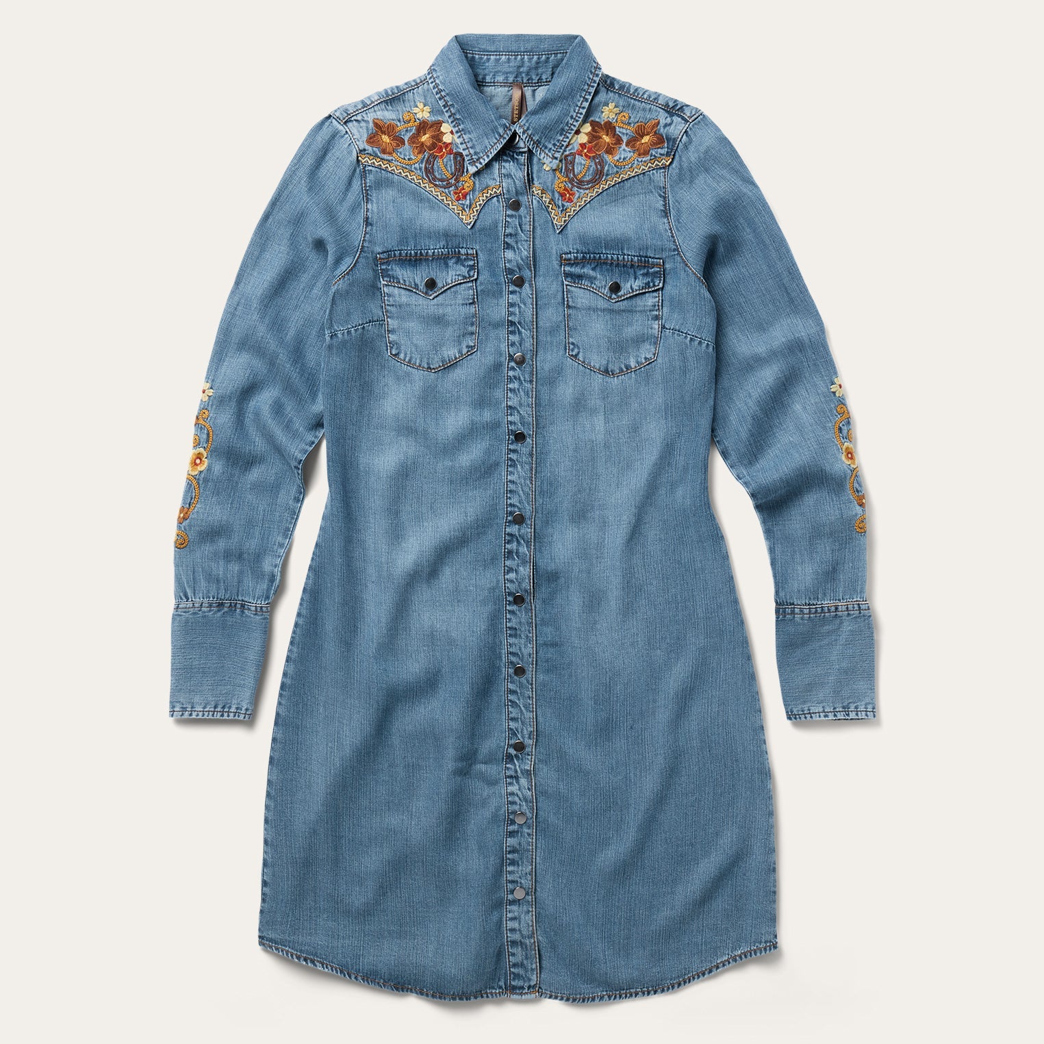 Crafted from high-quality 100% lyocell denim that’s been garment washed for extra softness, the Embroidered Western Shirt Dress blends feminine style with classic western character. It features deep single-point curved front and back yokes, patch pockets with flaps, a full snap front, five-snap cuffs, and statement-making floral embroidery.