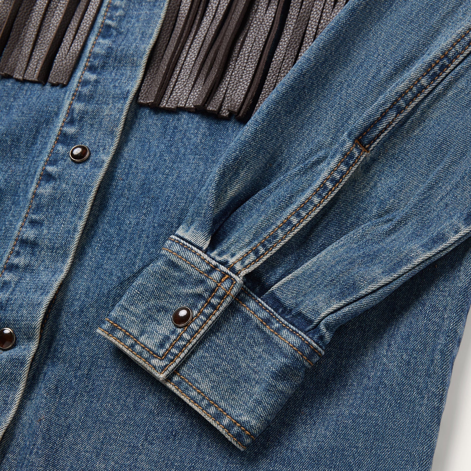 Traditionally used on buckskin garments to help shed rain, fringe remains a hallmark of western style—functional, iconic, and made to stand out. The Leather Fringe Denim Shirt is crafted from a soft, comfortable stretch denim blend and features statement-making leather fringe beneath the straight front and back yokes. It’s finished with a full snap front placket and long sleeves with single snap cuffs.
