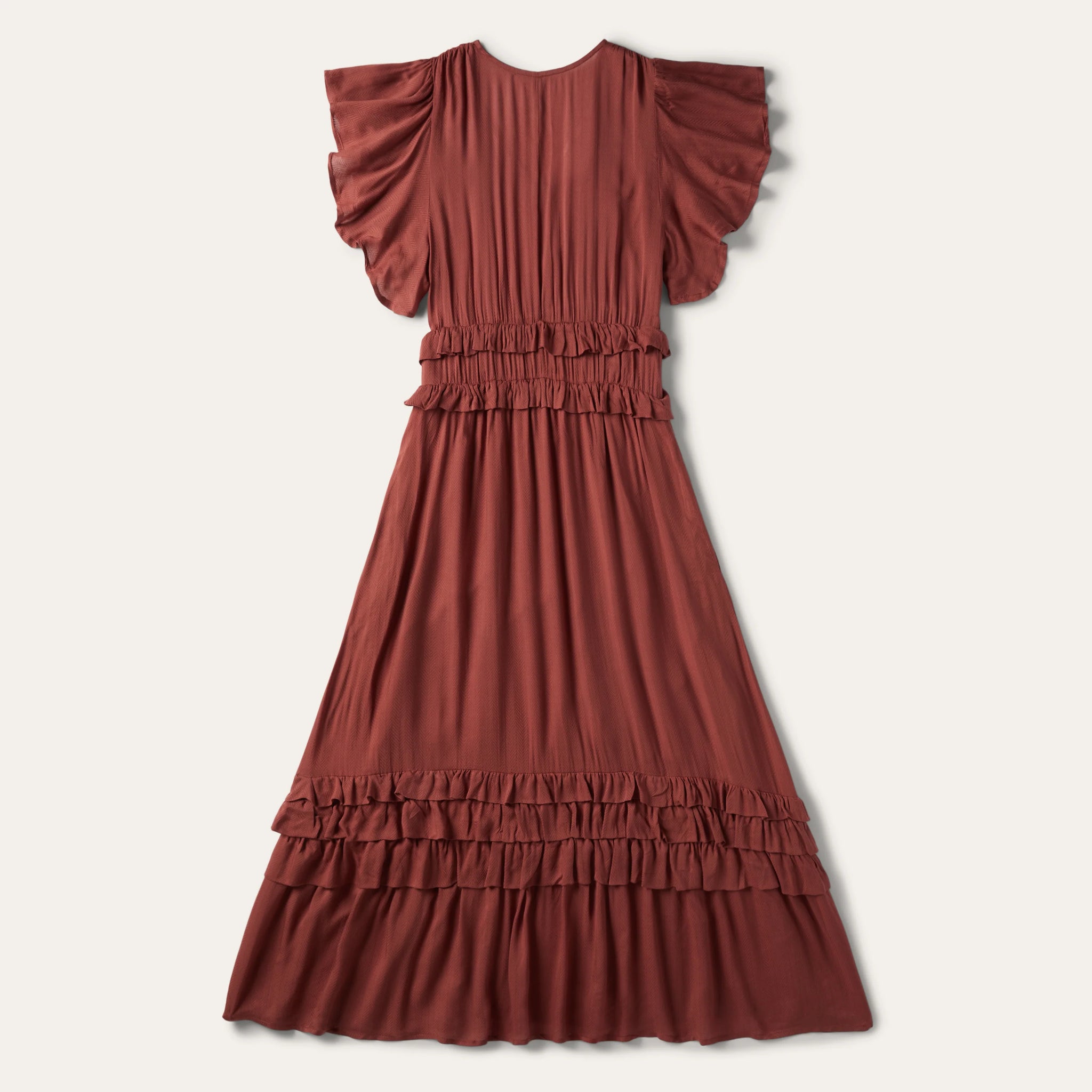 This fiery cinnamon pullover dress is woven from yarn-dyed 100% rayon herringbone. It has flutter ruffle sleeves with gathers at the shoulders and sleeves, an elastic waist with two rows of ruffles, three rows of tiered ruffles at the bottom of the skirt and side seam pockets.