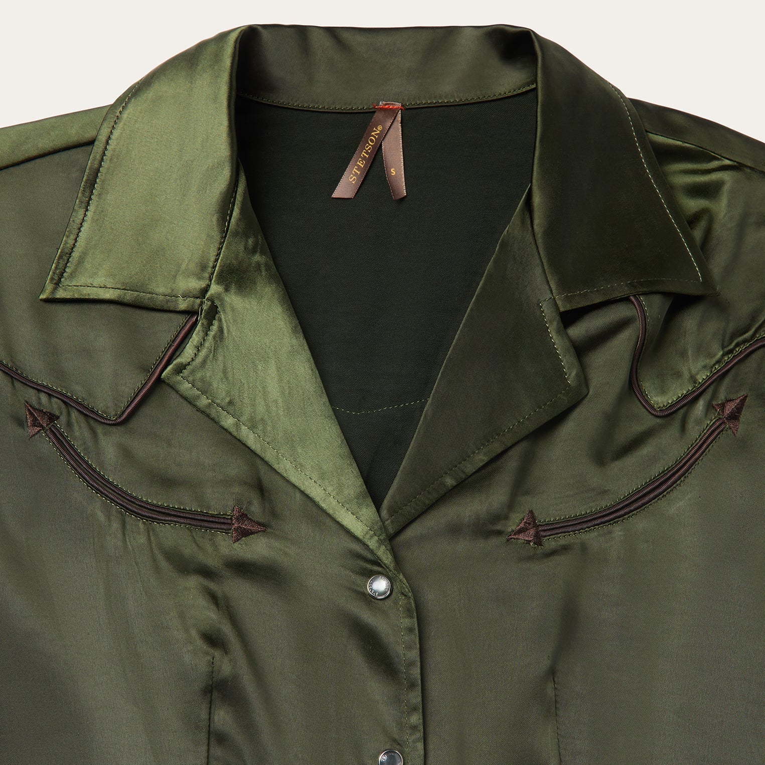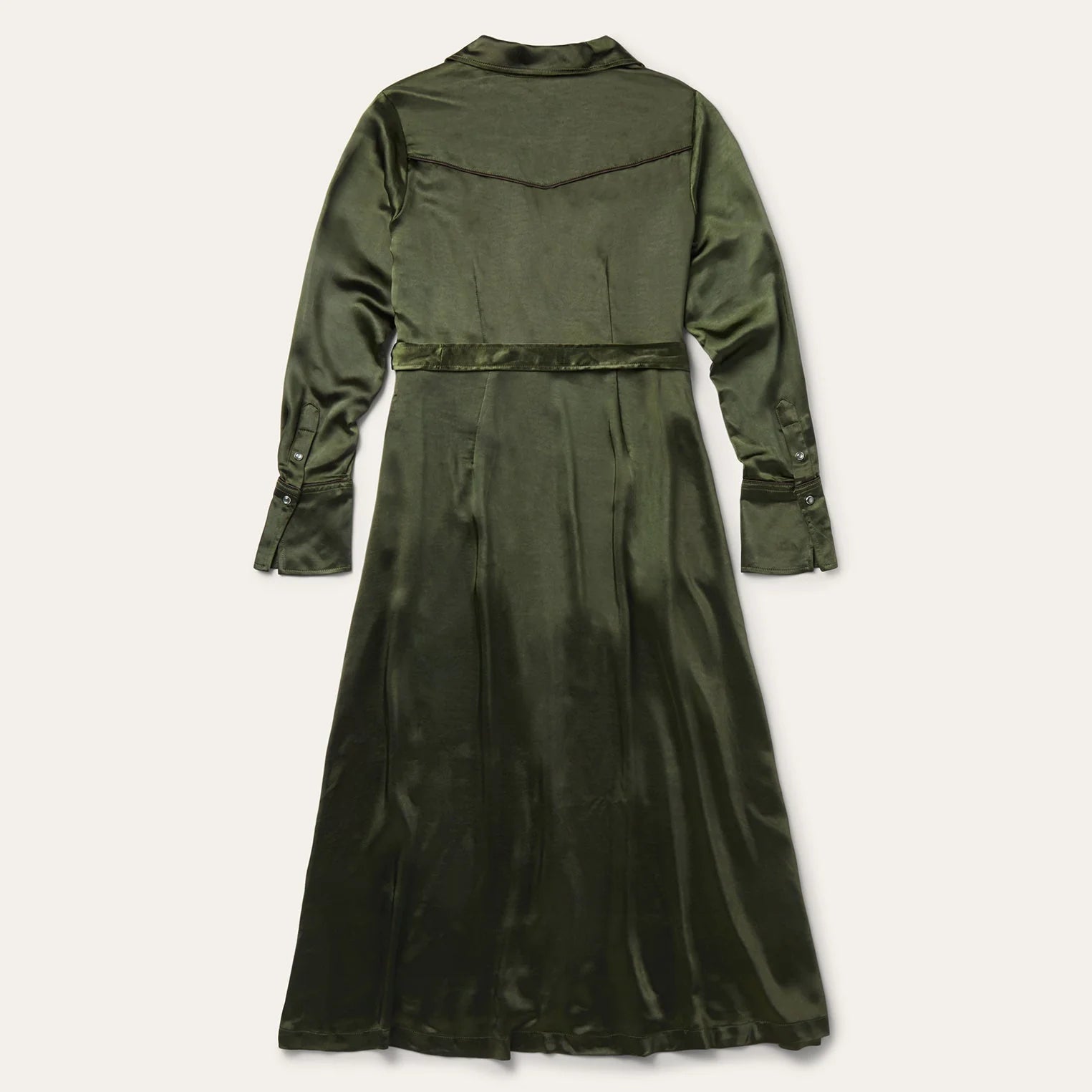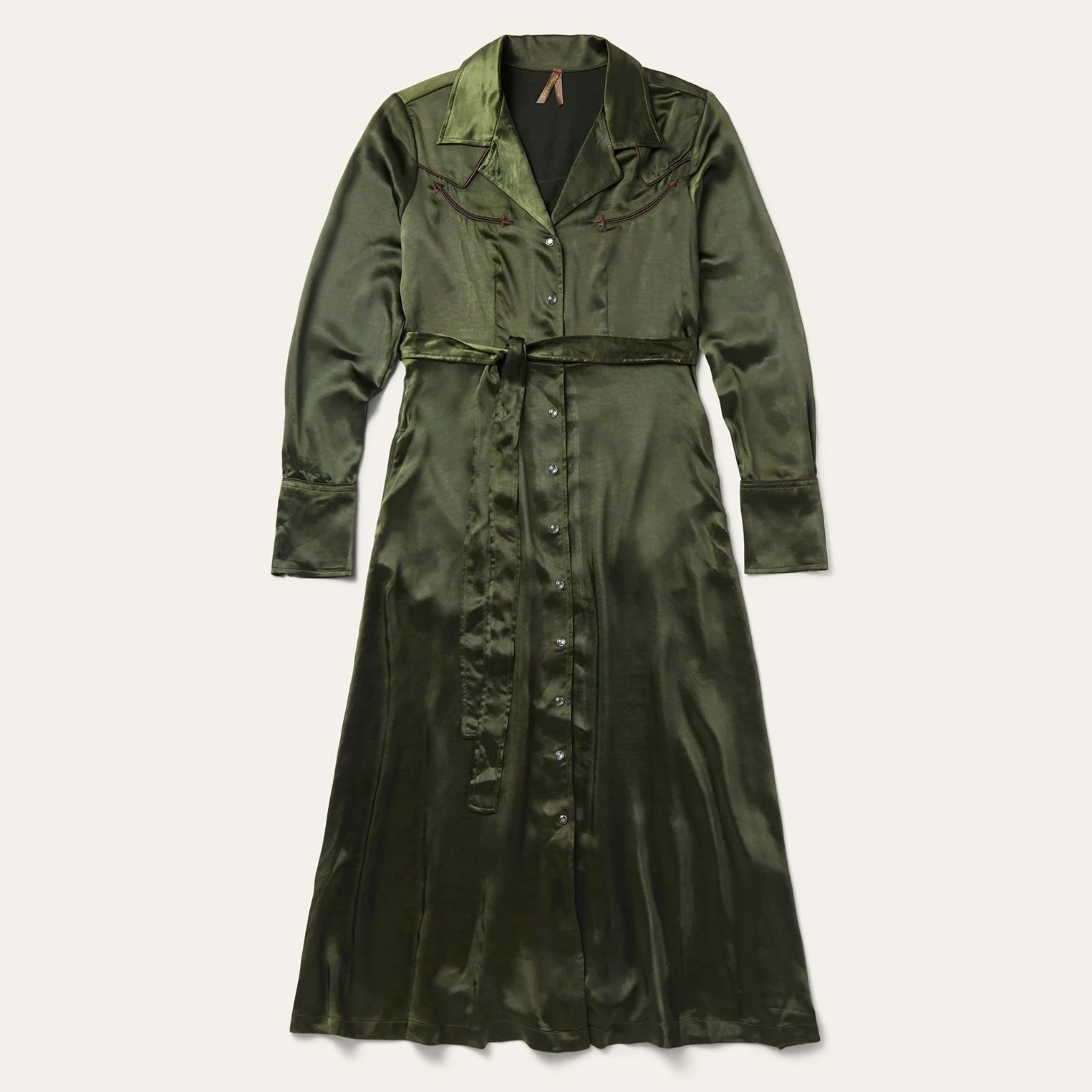 This timeless western-inspired shirt dress is crafted from smooth, high-quality polyester satin with a soft handfeel and subtle sheen. It has an open notch collar, single-point front and back yokes, a full front snap placket, and classic smile pockets. Its silhouette is enhanced by front and back darts, while a self-tie belt defines the waist. It’s cut with an easy, flattering drape that allows for all-day comfort and freedom of movement.