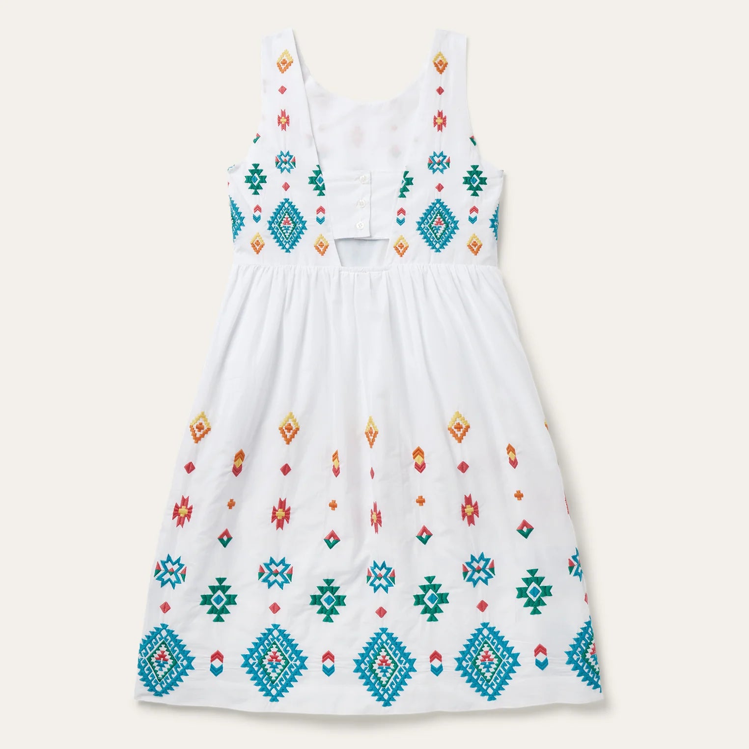 Colorful, lightweight and versatile, this white cotton lawn dress is embroidered with our vibrant red, yellow and turquoise Bright Schiffli design. It has an empire waist and large V back with a button strap closure. Darts at the bust provide a more custom-like fit, while the gathered skirt hits below the knees for a timeless silhouette. Made with smooth 100% high-quality white cotton lawn fabric, this lightweight, Western-inspired dress is ideal for any warm-weather gathering.