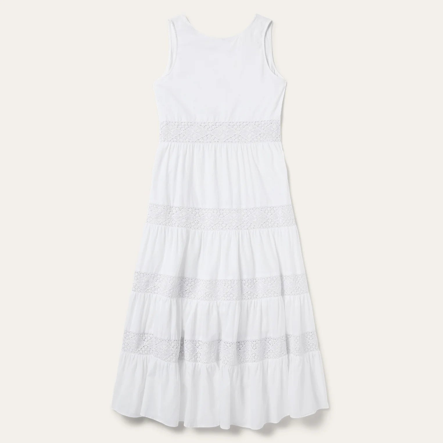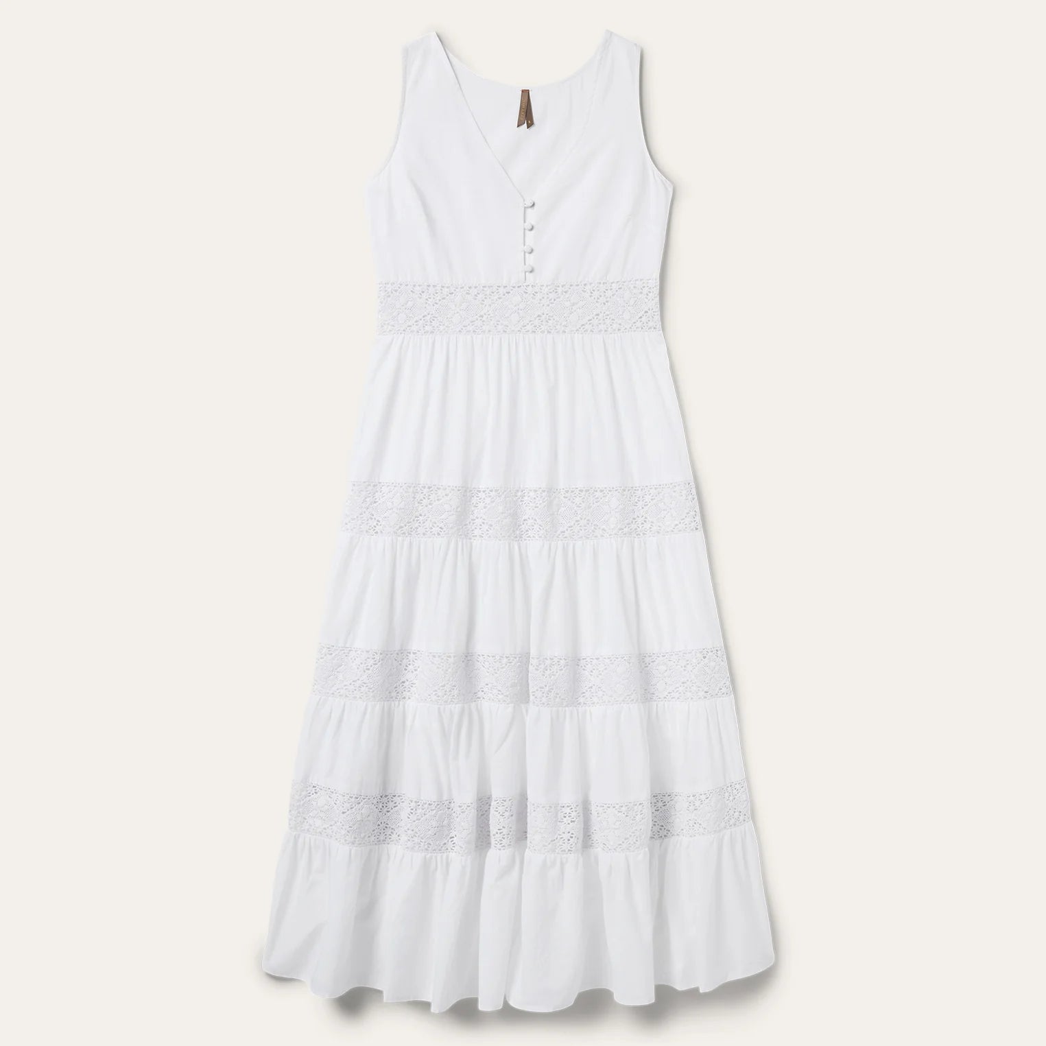 This white sleeveless calf-length dress is crafted from crisp, lightweight cotton lawn fabric. It has a v-neck with self covered button closure, lace insets and a gathered tiered skirt. Includes full bodice and partial skirt lining and an invisible side zipper. Cut with an easy, flattering drape, the dress allows for all-day comfort and freedom of movement.
