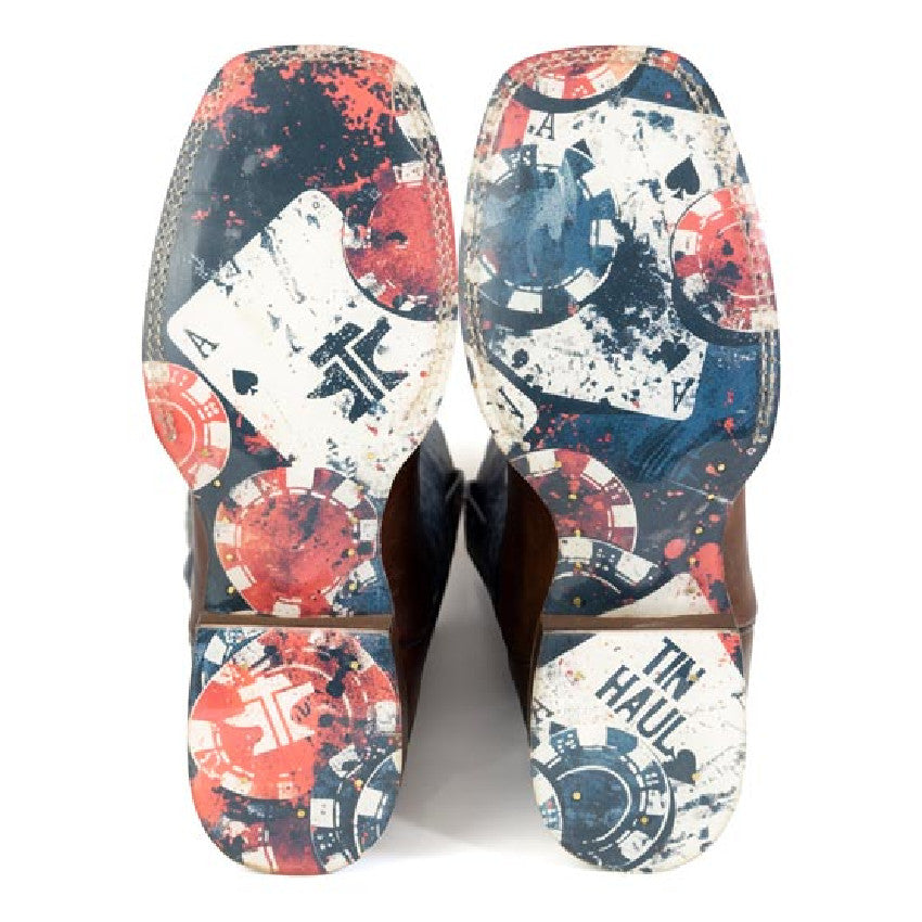 Make a statement with the Tin Haul Men's Dealers Choice Brown Leather Square Toe Boots 0551. These boots feature a lazered cards leather vamp and a sanded blue shaft, combining a bold, gambling-inspired style with premium craftsmanship. With a removable cushioned comfort insole and a durable leather outsole, they're built to provide lasting wear and stand up to every adventure.