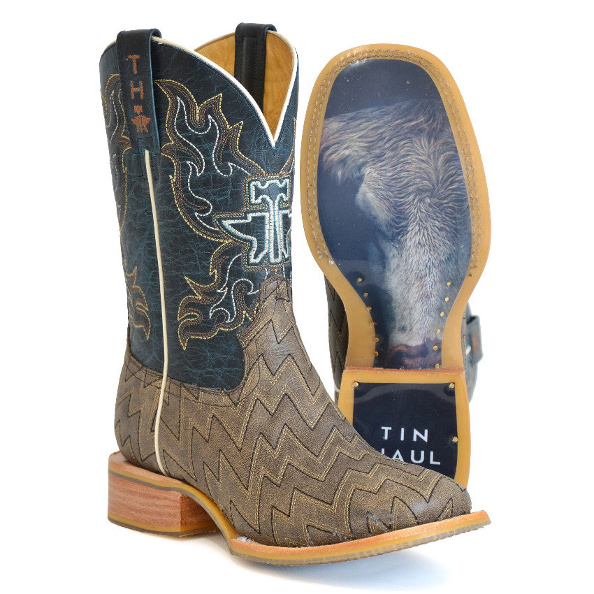 Make a statement with the Tin Haul Men's Lightning Strikes / Working Tan Leather Square Toe Boots 0502. These boots feature a stitched thunder vamp and a burnished blue shaft, combining a bold, unique style with premium craftsmanship. With a removable cushioned comfort insole and a durable leather outsole, they're built to provide lasting wear and stand up to every adventure.