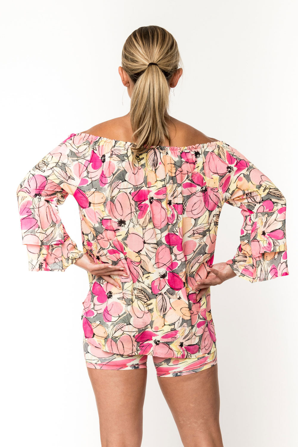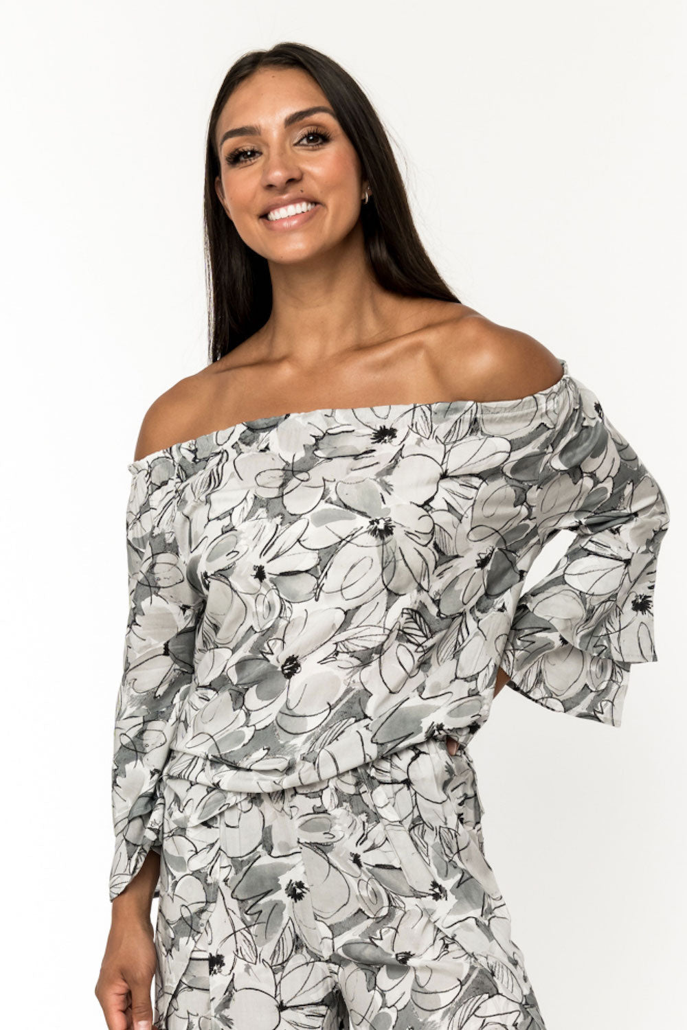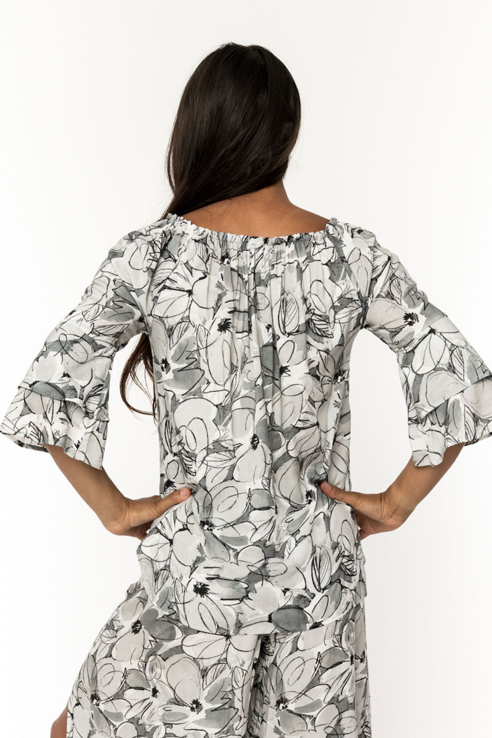 One of our most versatile pieces, Meg is a beautiful top you can wear "full coverage," with jeans, skirts or over leggings, or off the shoulder, as a sweet and sexy pairing with all the above. Double bell sleeves keep the style flowy and feminine. Made of 100% rayon. SKU# 22T201