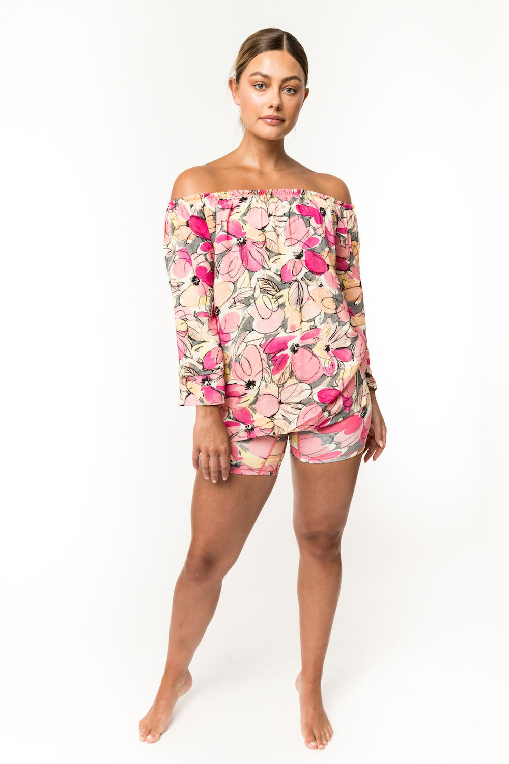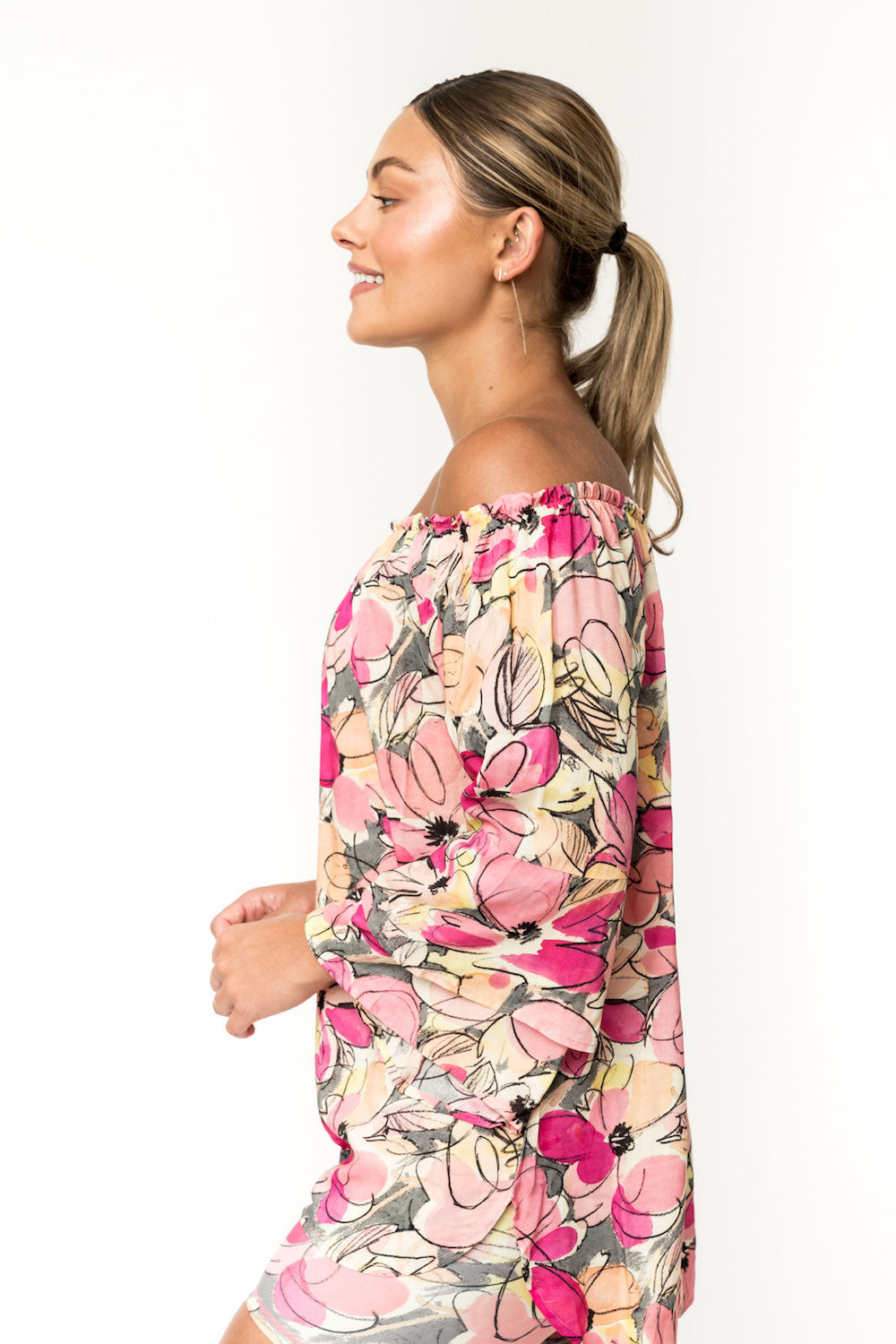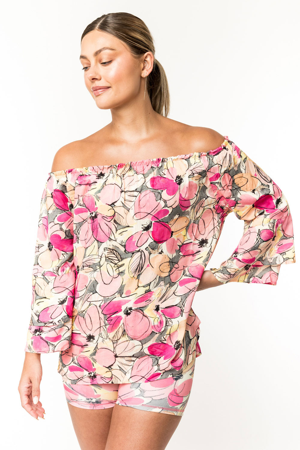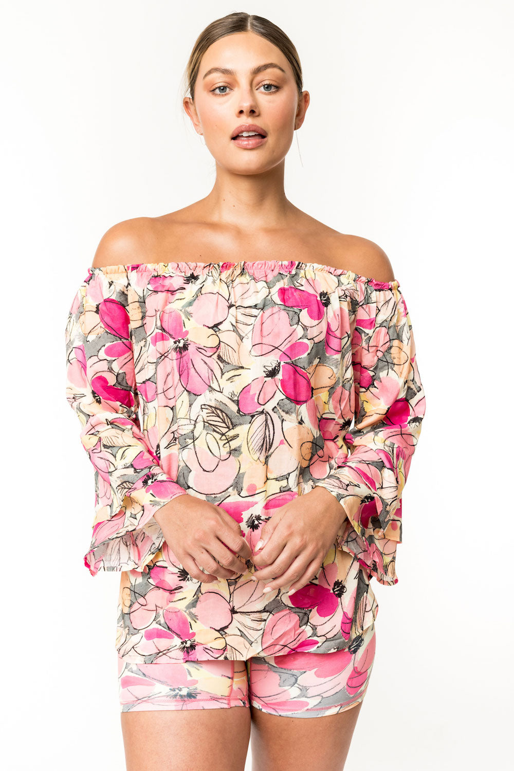 One of our most versatile pieces, Meg is a beautiful top you can wear "full coverage," with jeans, skirts or over leggings, or off the shoulder, as a sweet and sexy pairing with all the above. Double bell sleeves keep the style flowy and feminine. Made of 100% rayon. SKU# 22T201